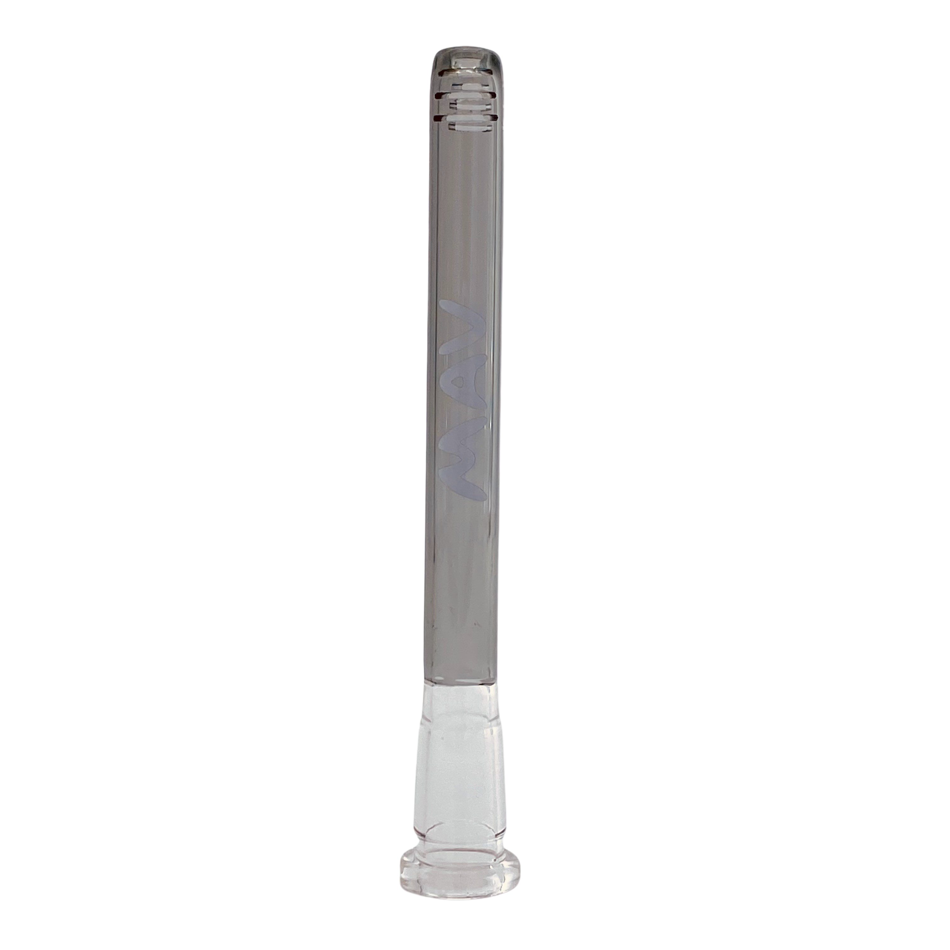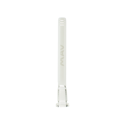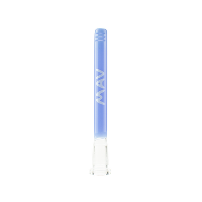 The MAV Glass Color Downstem measures 5" from joint to tip with an 18mm to 14mm configuration featuring flat slit diffusion and unground joint construction. With a 19mm outer diameter and 14mm inner diameter, this colored glass downstem fits standard 18" beaker-style water pipes as a replacement or upgrade component.