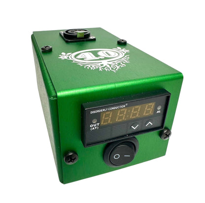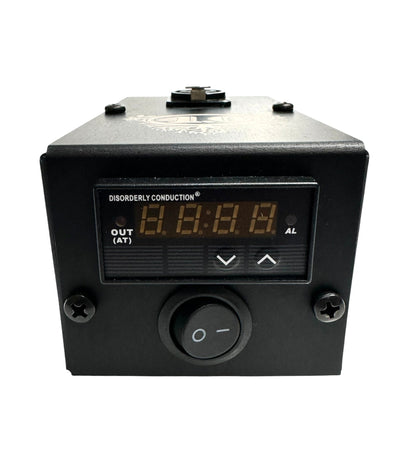 The 4.0 Glass Aluminum Single Port Enail Controller by Disorderly Conduction works with Cobra Coils and custom E-quartz products with laser etching by 4 Point 0 Glass. This single-port aluminum unit includes a 2-year warranty from Disorderly Conduction for reliable temperature control applications.