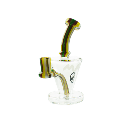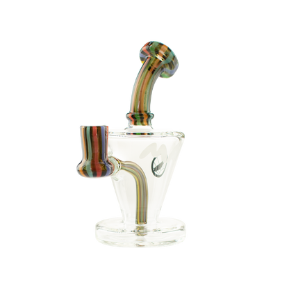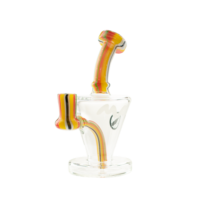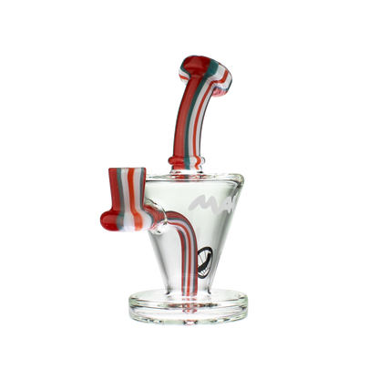 The MAV Glass Candy Cone Rig stands 8" tall with a 4" diameter hollow base and features a cone vortex design with a 2-hole diffuser for filtration. This dual-purpose piece accommodates both botanicals and concentrates through its 14mm female joint with included bowl and bent neck mouthpiece.