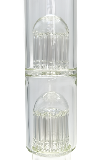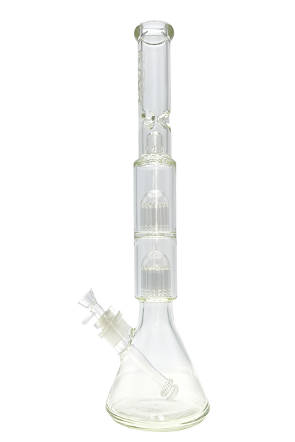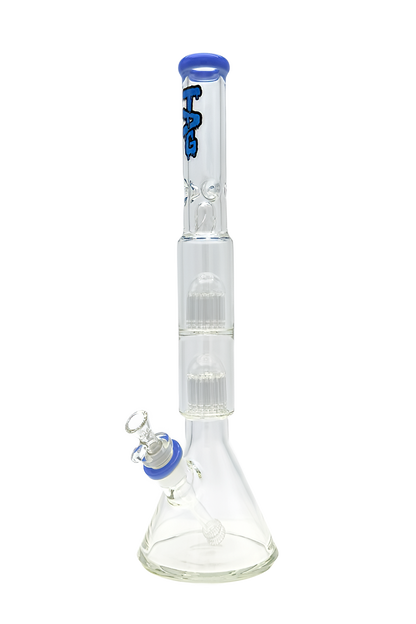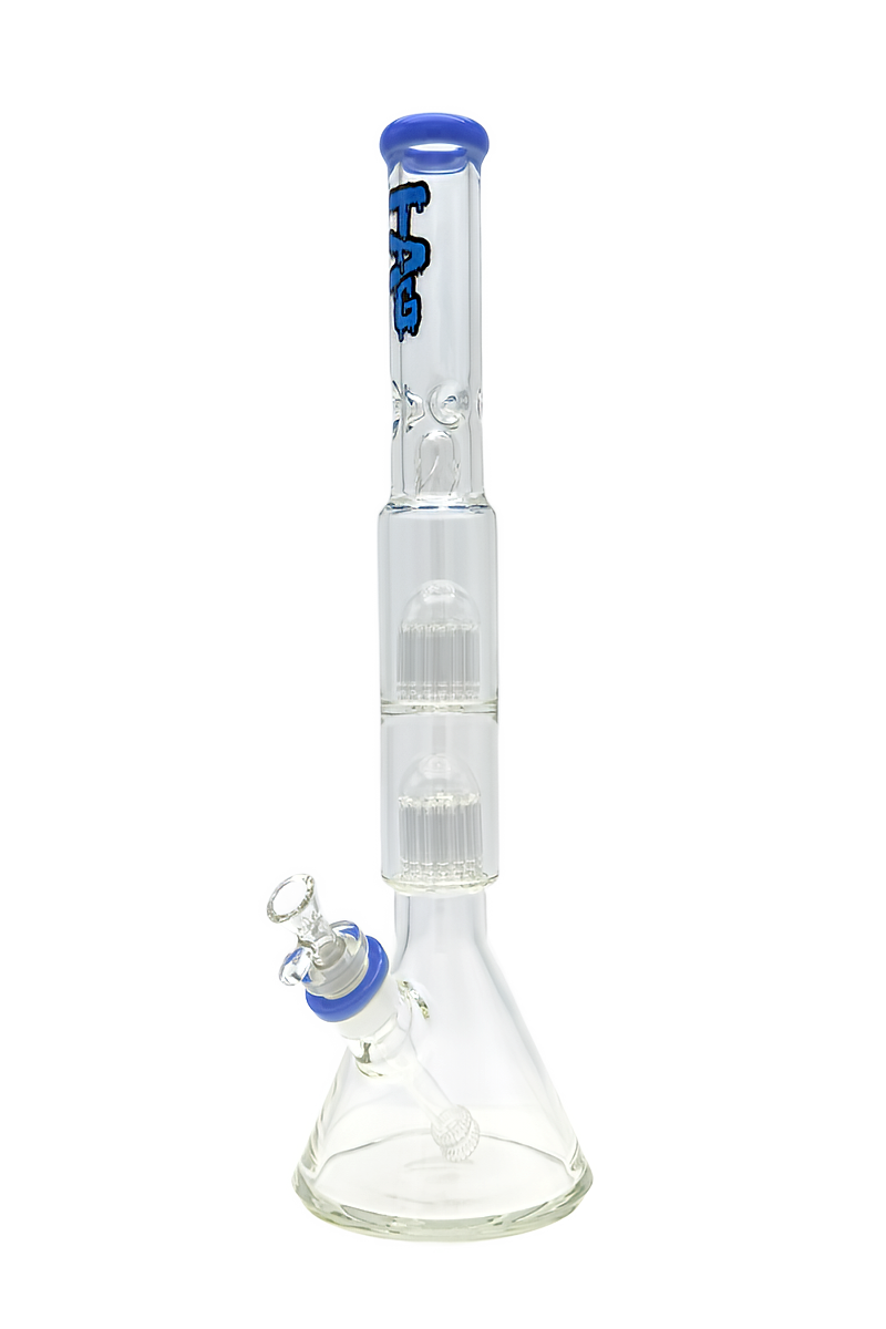 The TAG Double Tree Beaker features borosilicate glass construction with dual tree percolators for multi-stage diffusion and a beaker base for stable positioning. This water pipe includes a female joint compatible with standard male fittings and dual percolation chambers for enhanced filtration.