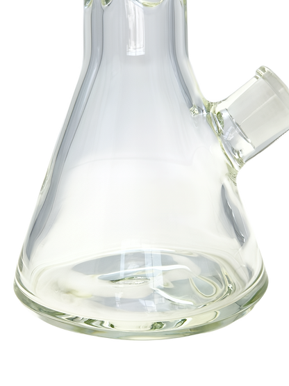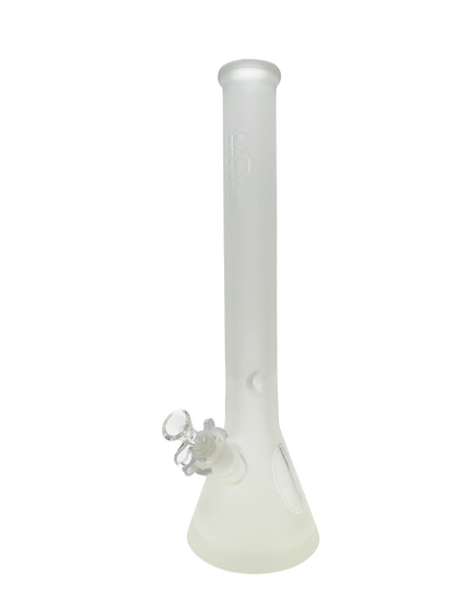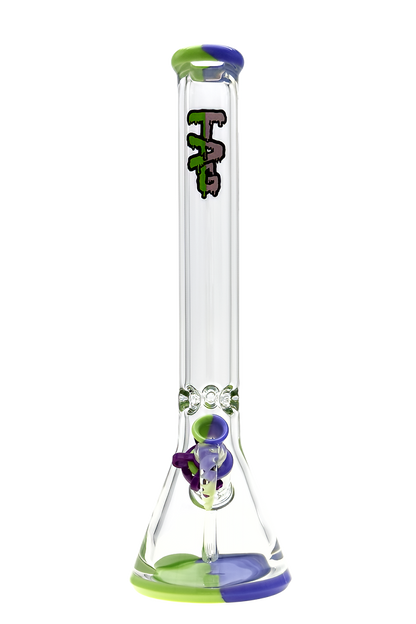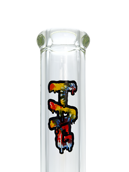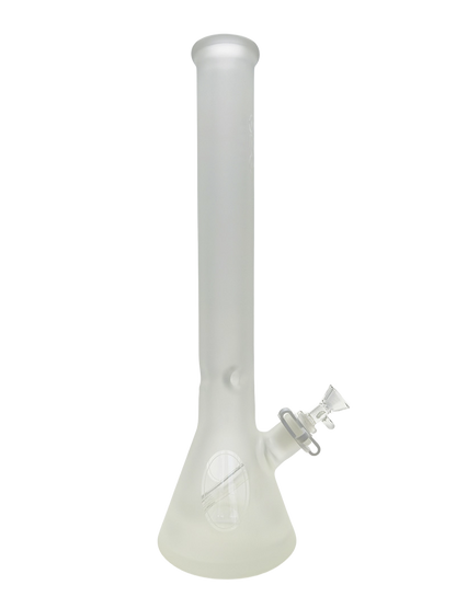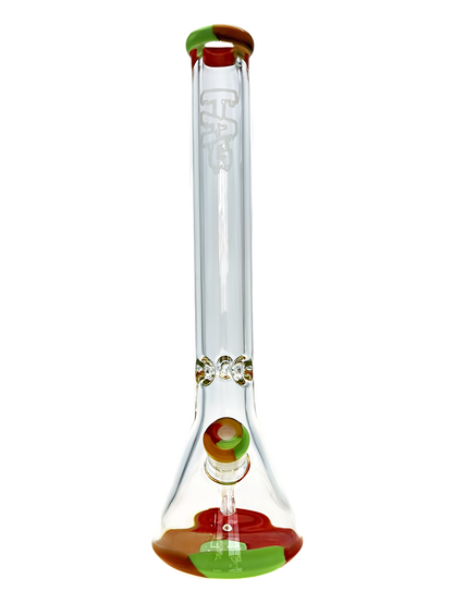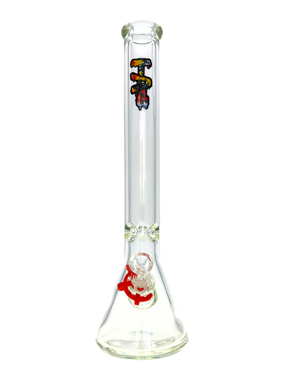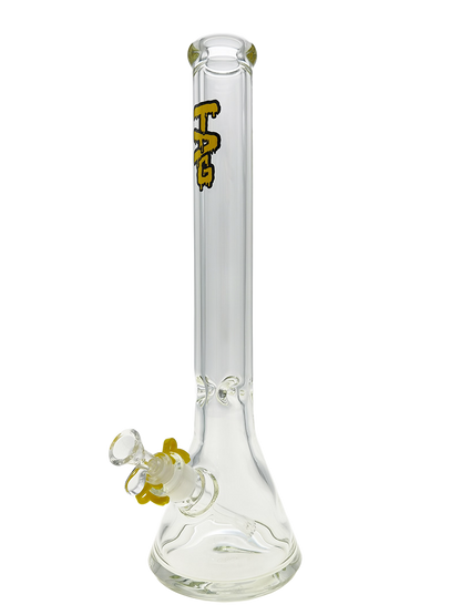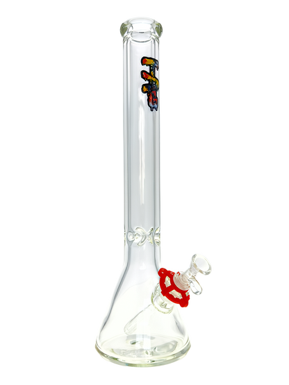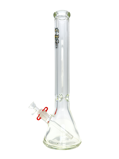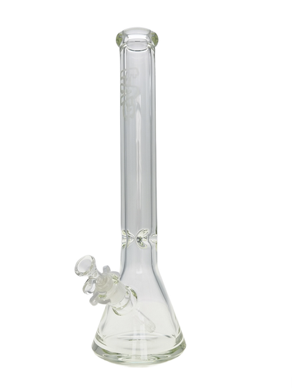 The TAG Extra Large Super Thick Beaker features 50x9mm borosilicate glass construction with a wide stable base and chamfered edge design for enhanced durability. This beaker includes an 18mm super thick female joint, Super Slit open-end downstem with high slit density for efficient diffusion, pinched screen handle slide with built-in glass screens, and TAG Super Thick Keck Clip, plus an ice-free neck for unrestricted airflow and simplified maintenance.