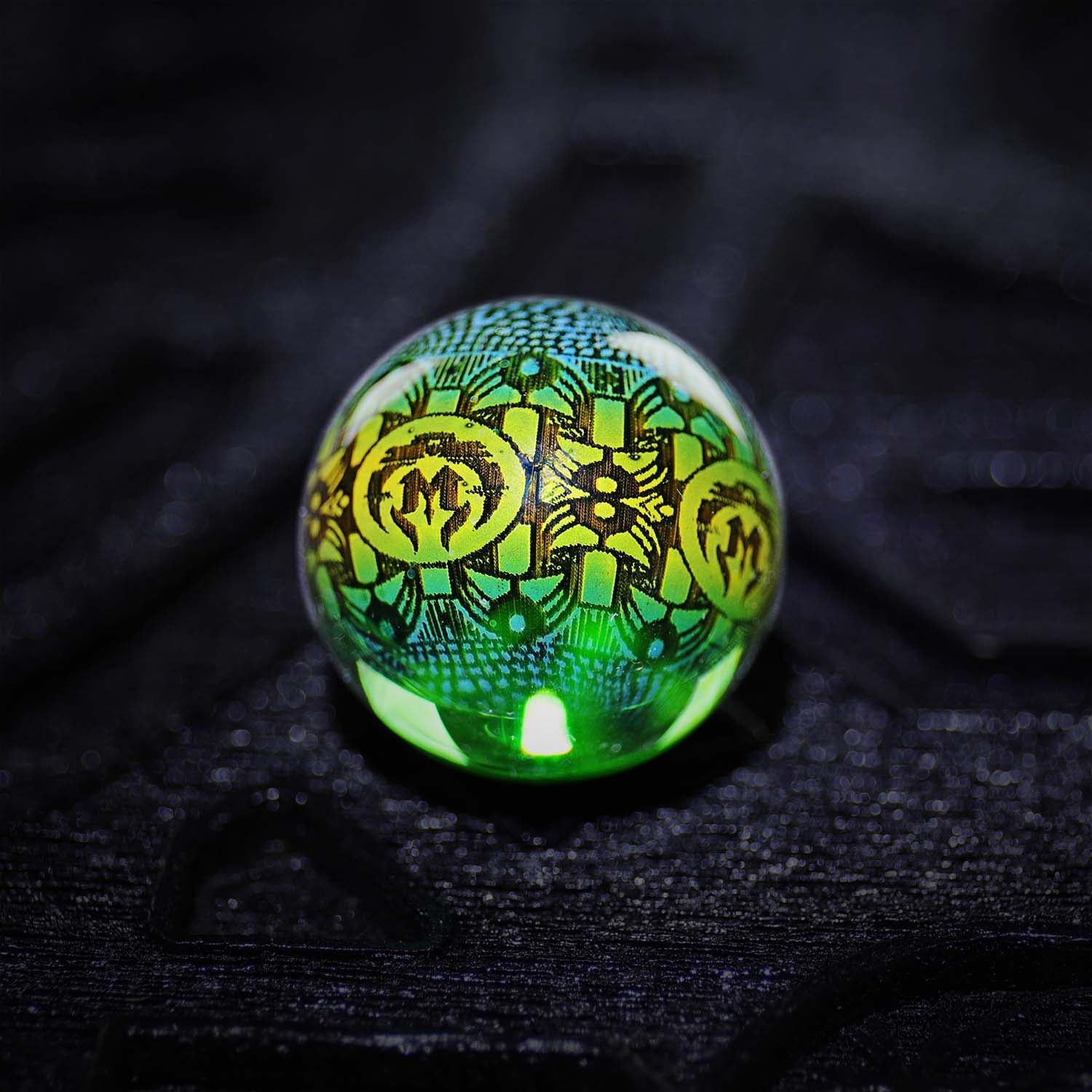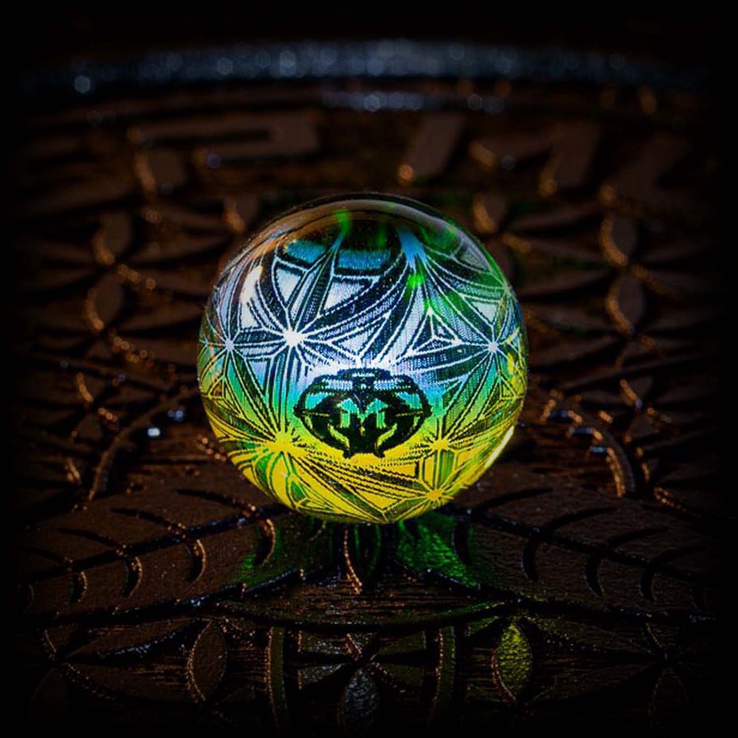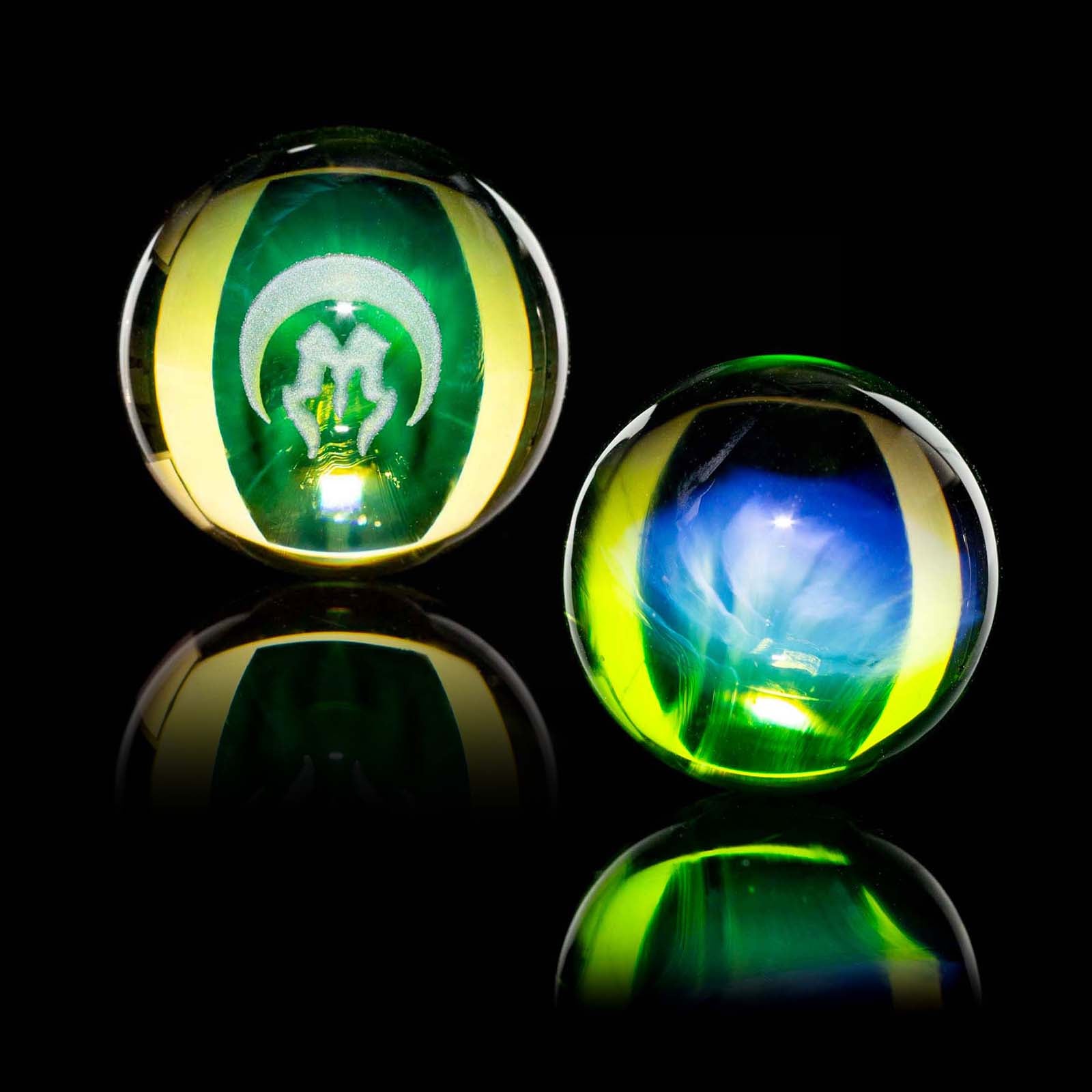 The Mothership Glass Hologram Slurper Marble measures 18mm-21mm and is designed for compatibility with slurper-style bangers.