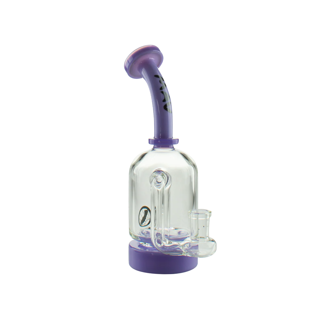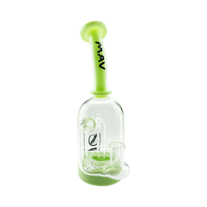 The MAV Glass Dropdown Can features classic can shape construction with long bent neck design to eliminate splashback. This concentrate rig includes drop-down joint for extended cooling time and 2-hole percolation with hollow base chamber for enhanced flavor preservation.