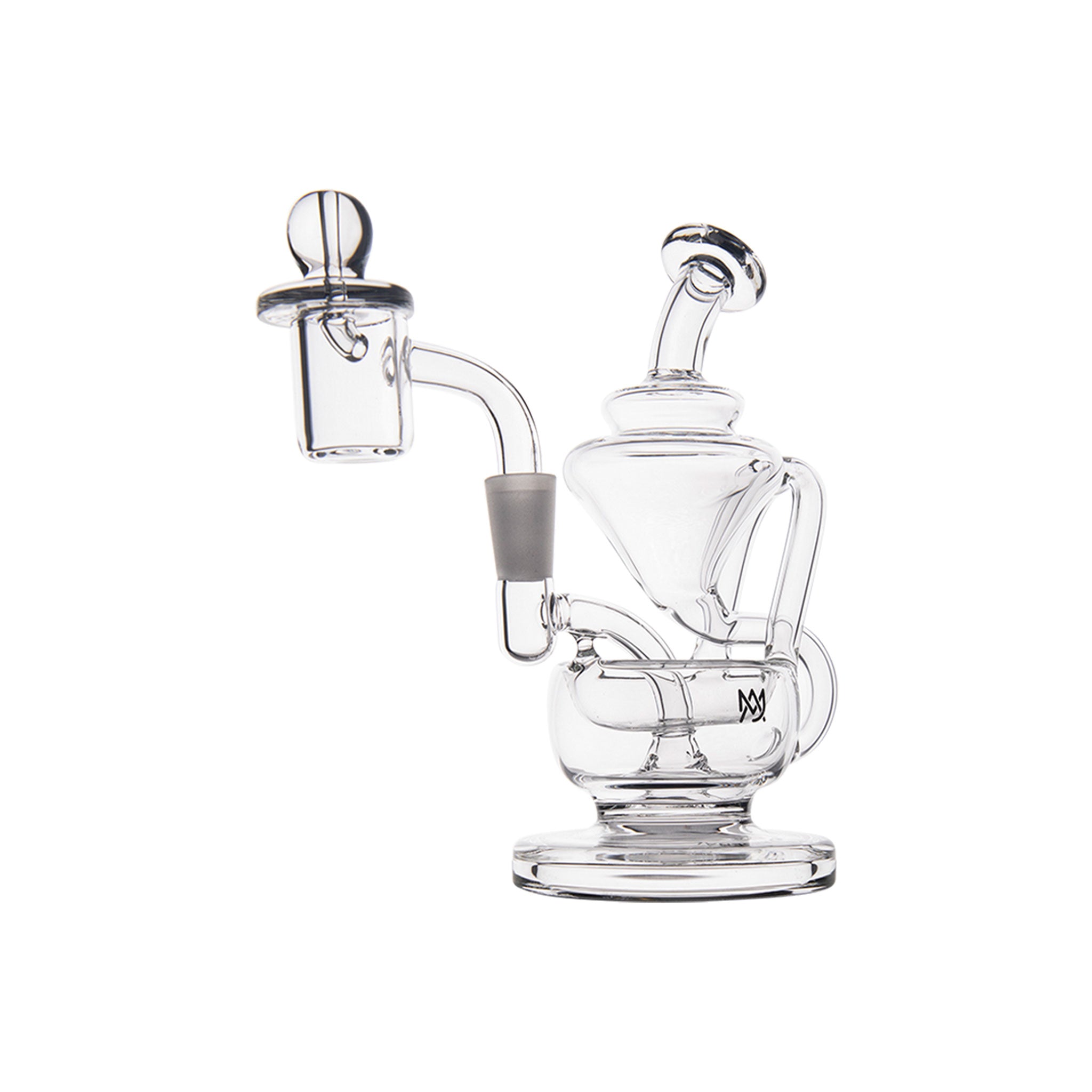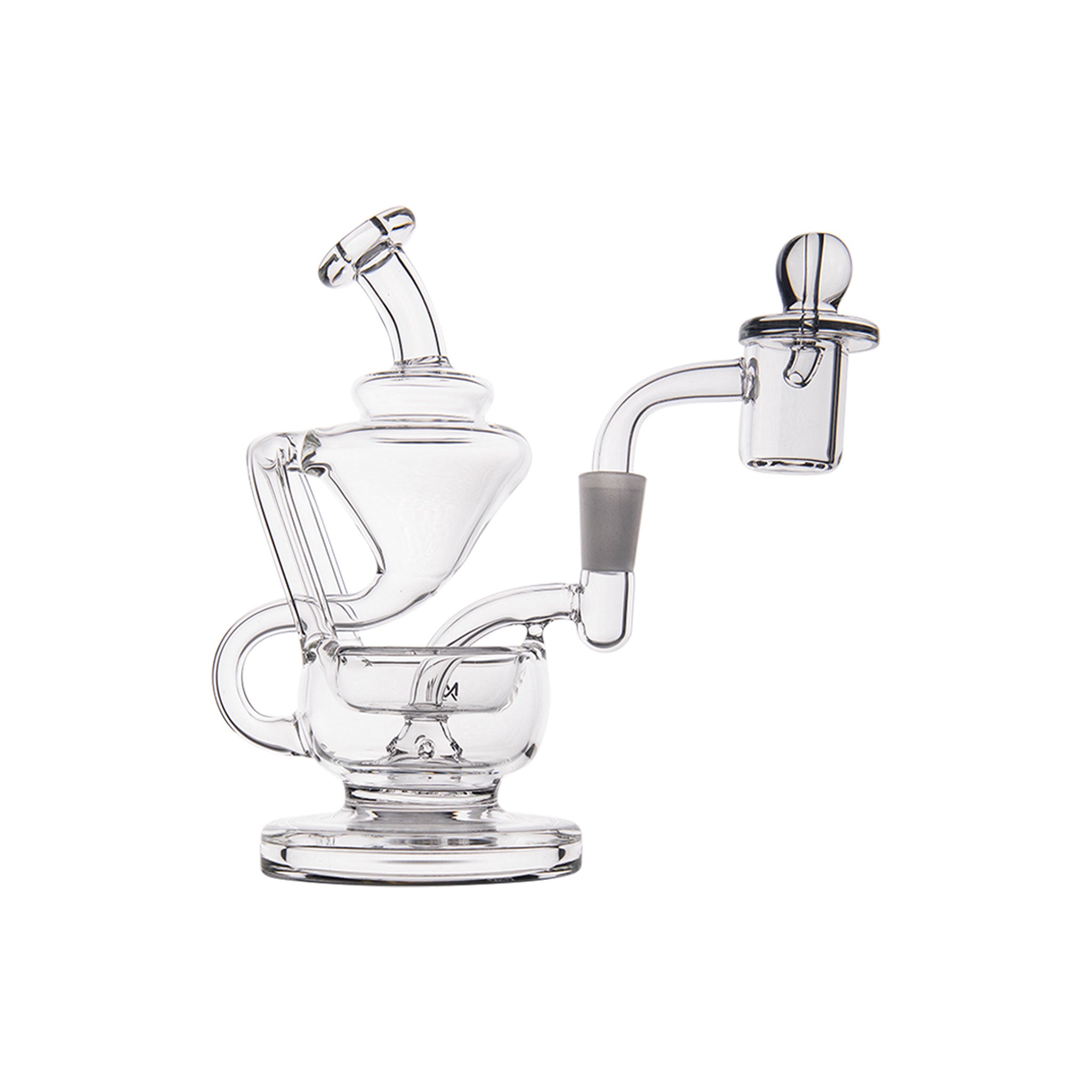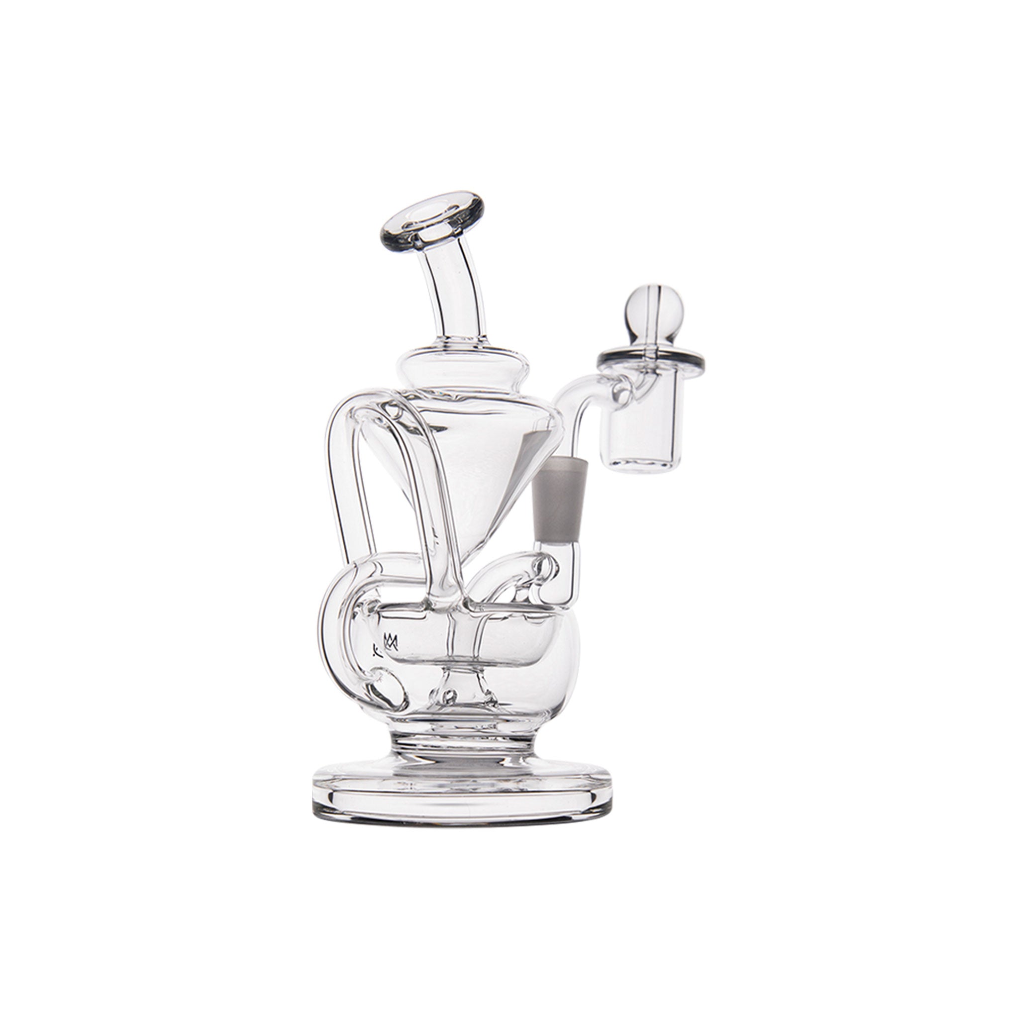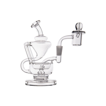 The MJ Arsenal Claude Mini Rig features a double uptake recycler design with protruding aesthetic aqueducts that guide water through two clear turbines, cooling vapor with each inhale for enhanced flavor delivery. This compact concentrate rig includes a built-in reclaim catcher, quartz banger, and splash-resistant architecture with a wide base for stability, all crafted from high-quality borosilicate glass that withstands high temperatures.
