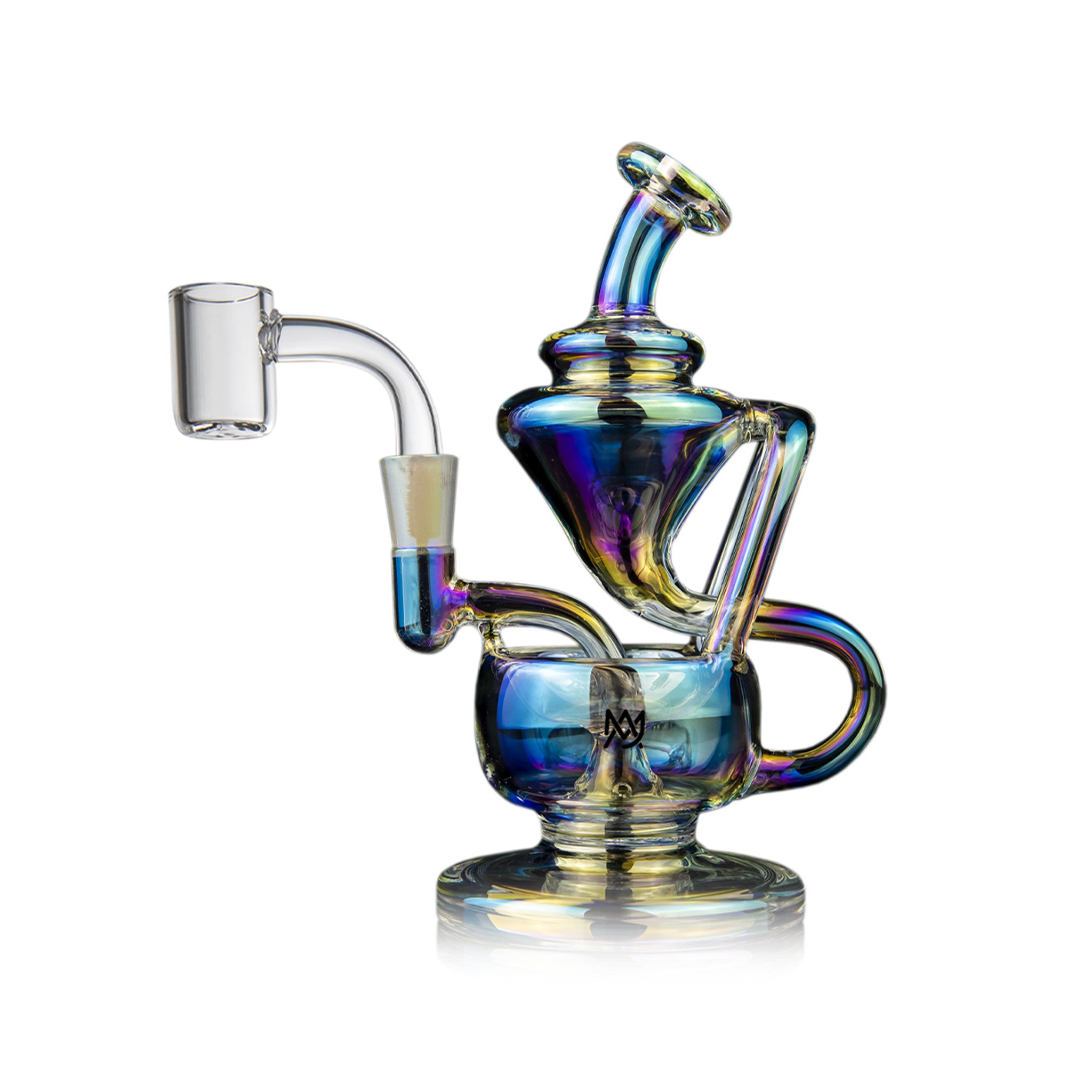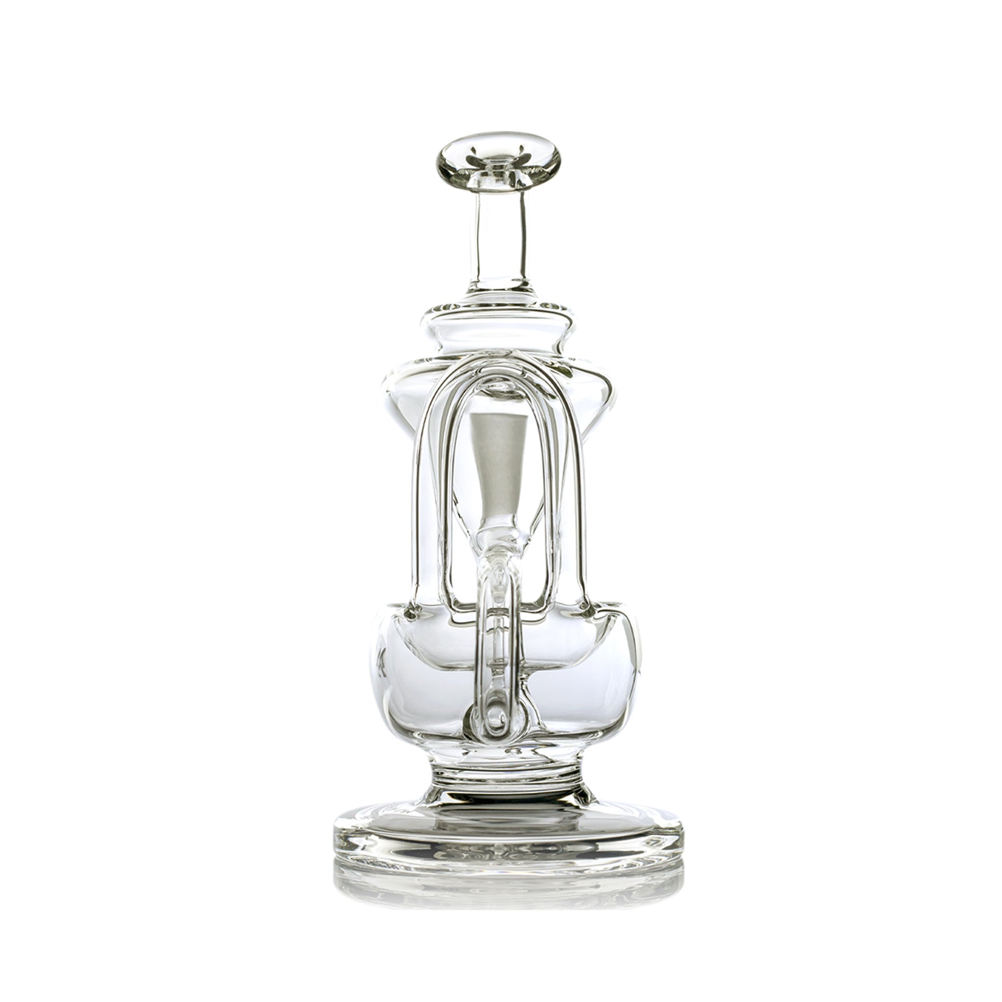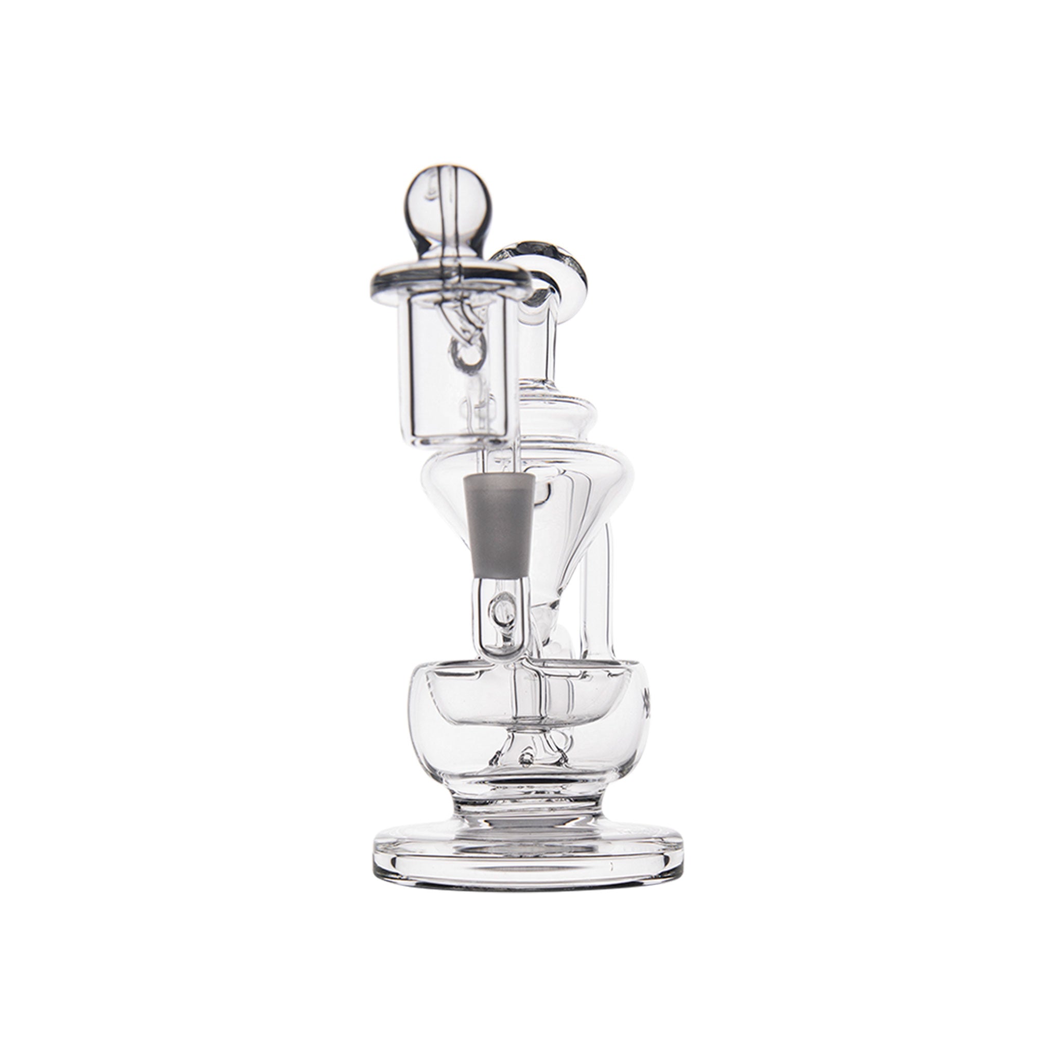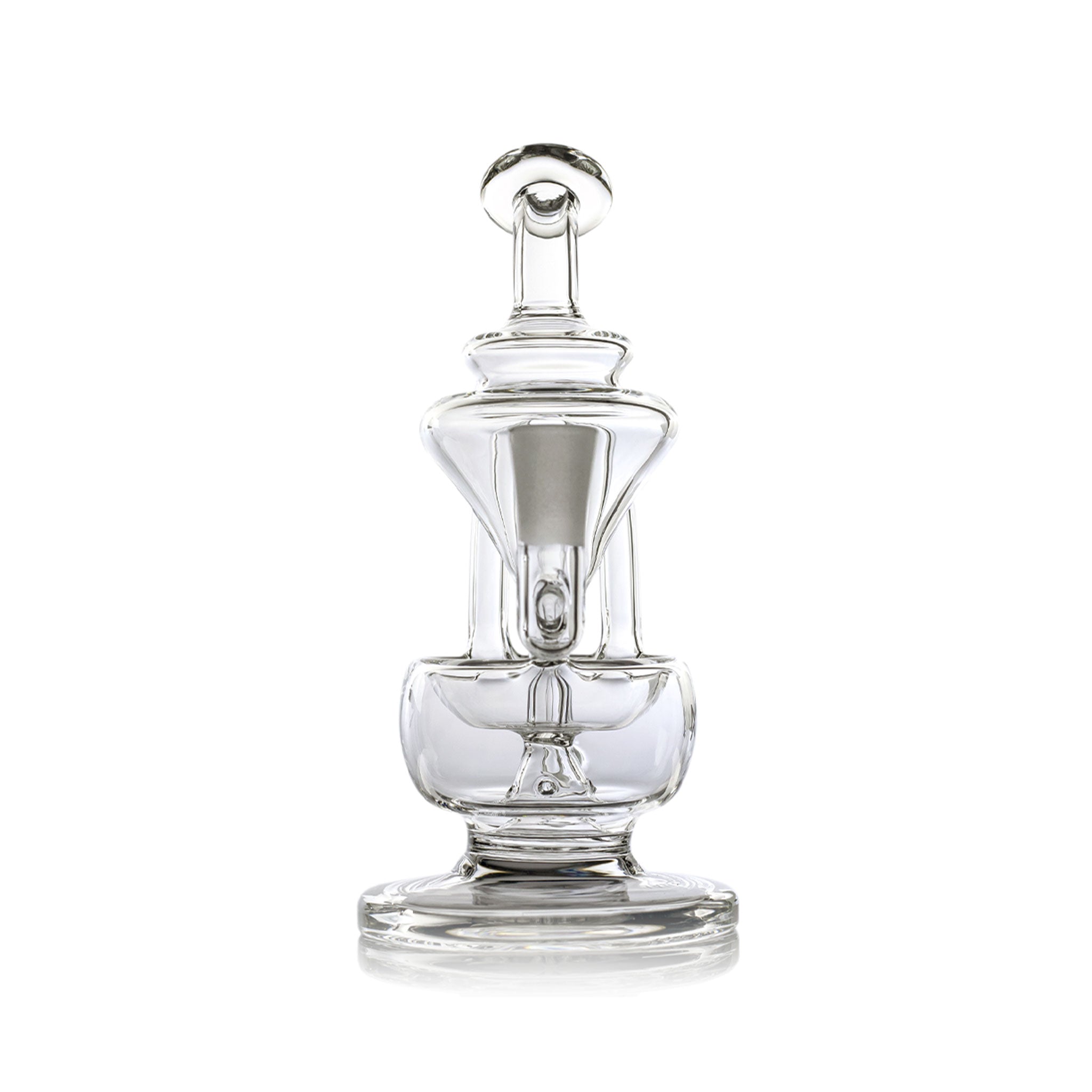 The MJ Arsenal Claude Mini Rig features a double uptake recycler design with protruding aesthetic aqueducts that guide water through two clear turbines, cooling vapor with each inhale for enhanced flavor delivery. This compact concentrate rig includes a built-in reclaim catcher, quartz banger, and splash-resistant architecture with a wide base for stability, all crafted from high-quality borosilicate glass that withstands high temperatures.