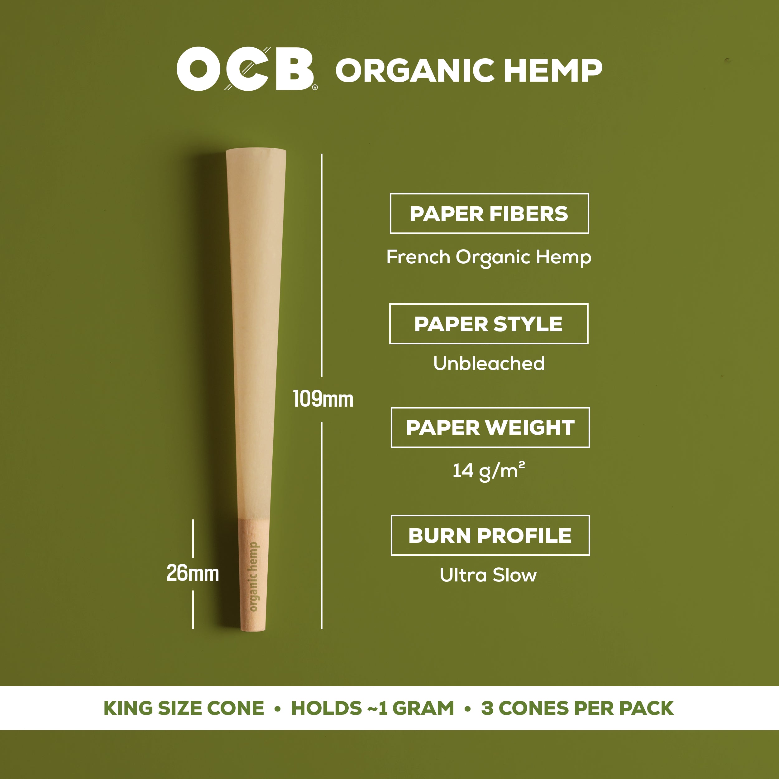 The OCB® Organic Hemp King Cones feature organically grown hemp from Champagne, France crafted directly from the source plant material. Each pack contains 3 cones for simple, enjoyable sessions.