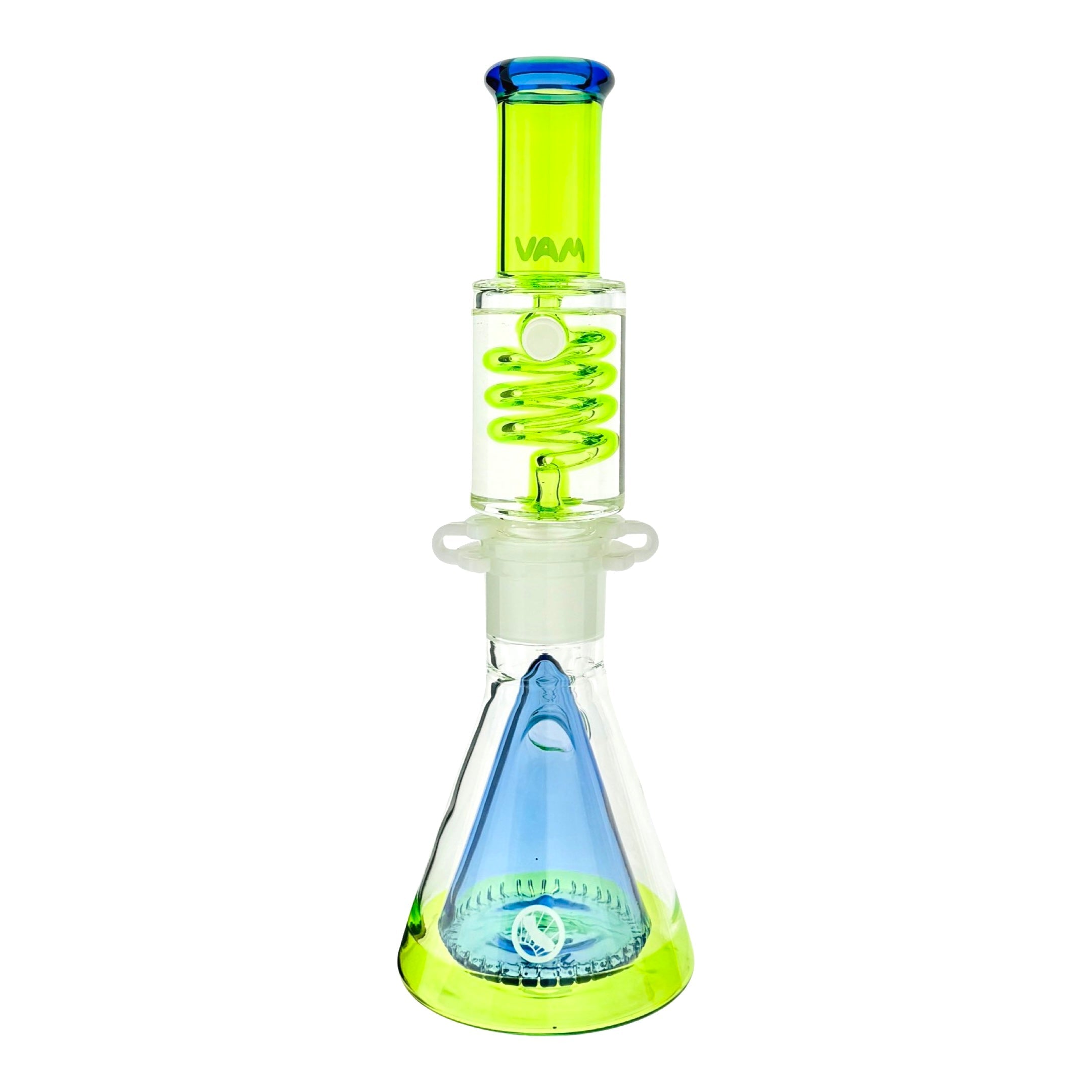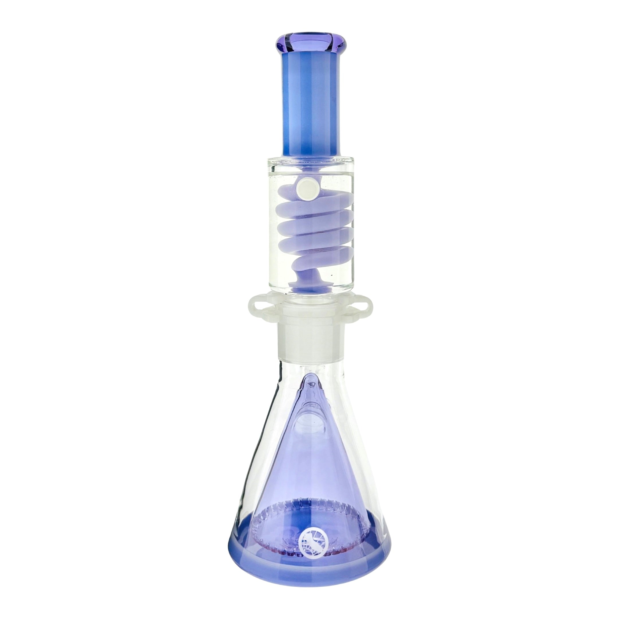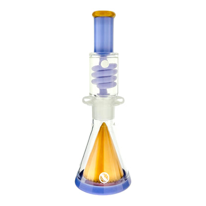 The Mav Glass Oversized Freezable Pyramid Beaker features a two-piece borosilicate glass design with a removable glycerin-filled chamber that can be frozen for enhanced cooling during sessions. The pyramid percolator at the base diffuses smoke through the water chamber while the frozen glycerin coil provides additional temperature reduction without dilution. Support the base during handling to prevent sliding and breaking.