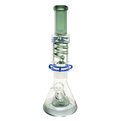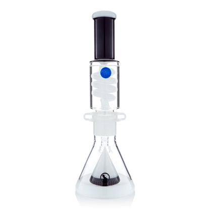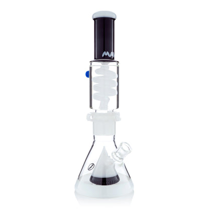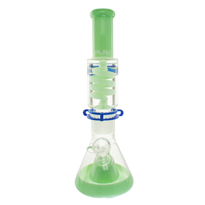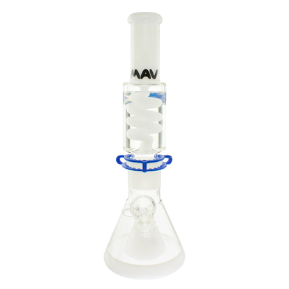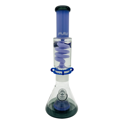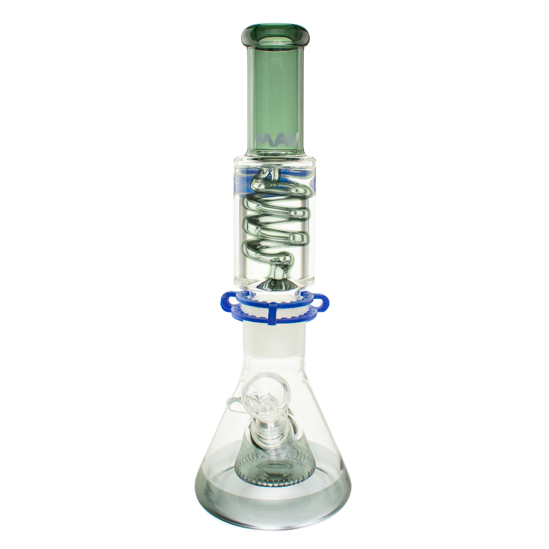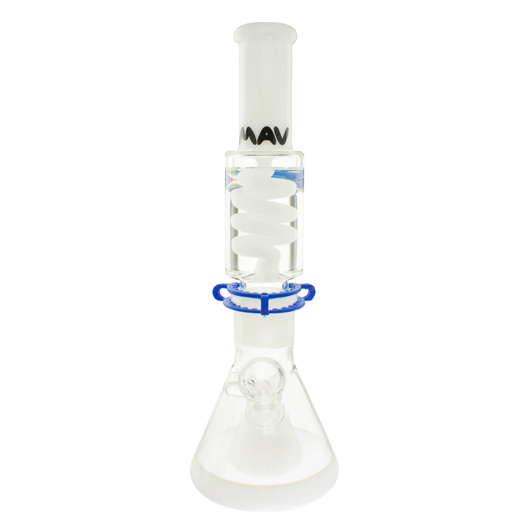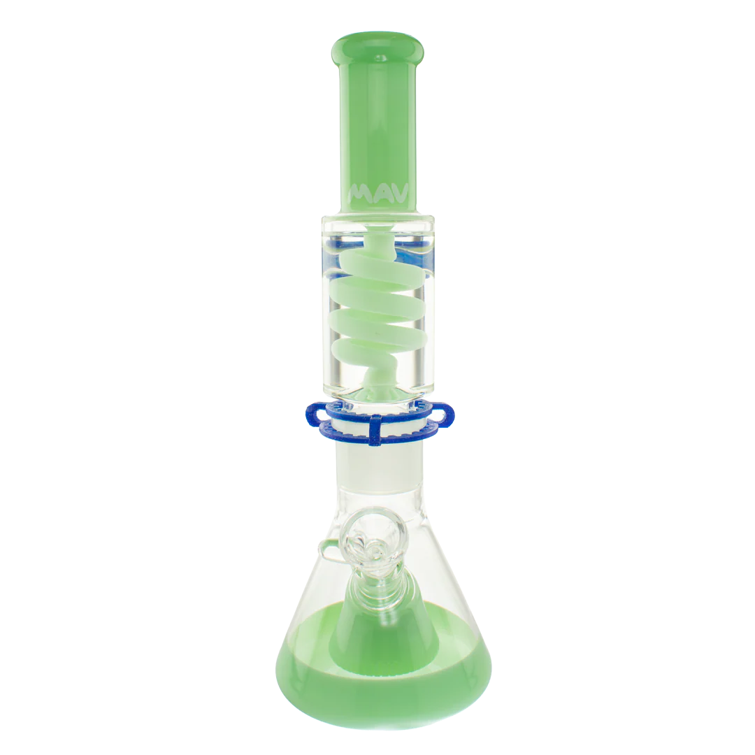 The Mav Glass Slitted Pyramid Beaker Freezable Coil System features a removable glycerin coil chamber that chills vapor through sub-zero temperature retention without freezing solid, paired with a slitted pyramid percolator at the base for additional diffusion. This 14" tall beaker includes a 19mm female joint with holding clip, matching 19mm accessory, and uniquely designed cap, requiring careful handling with base support due to its two-piece construction.