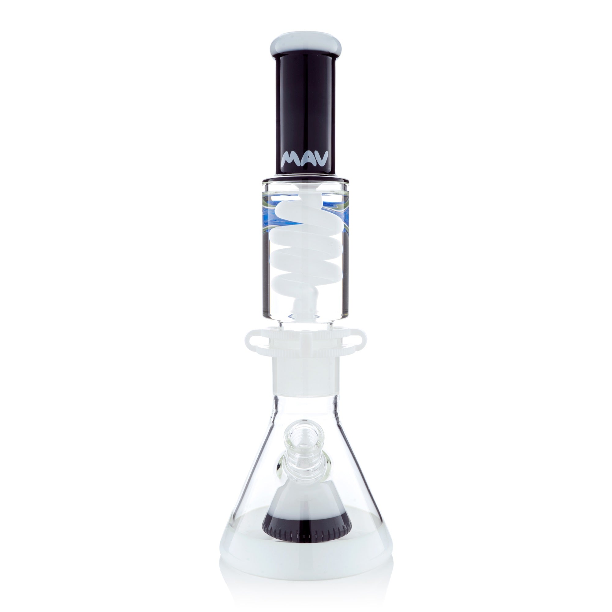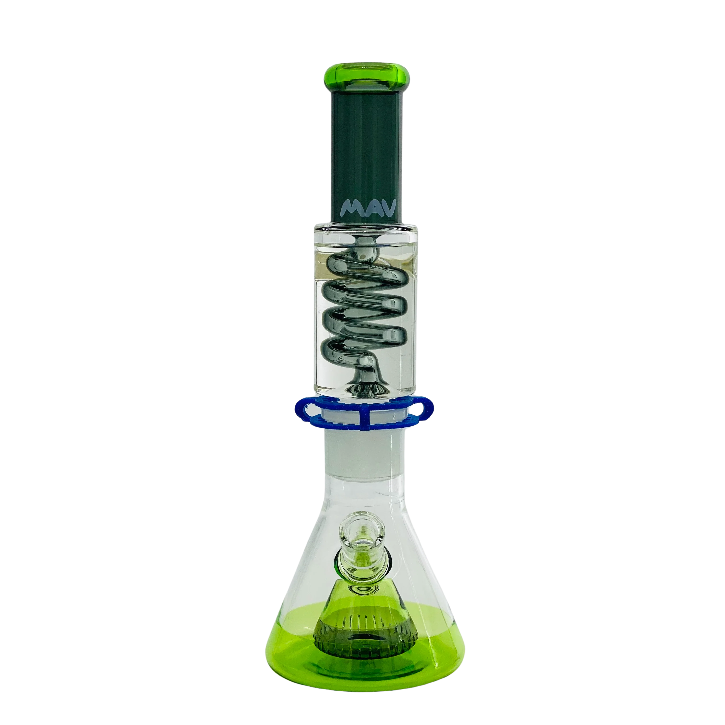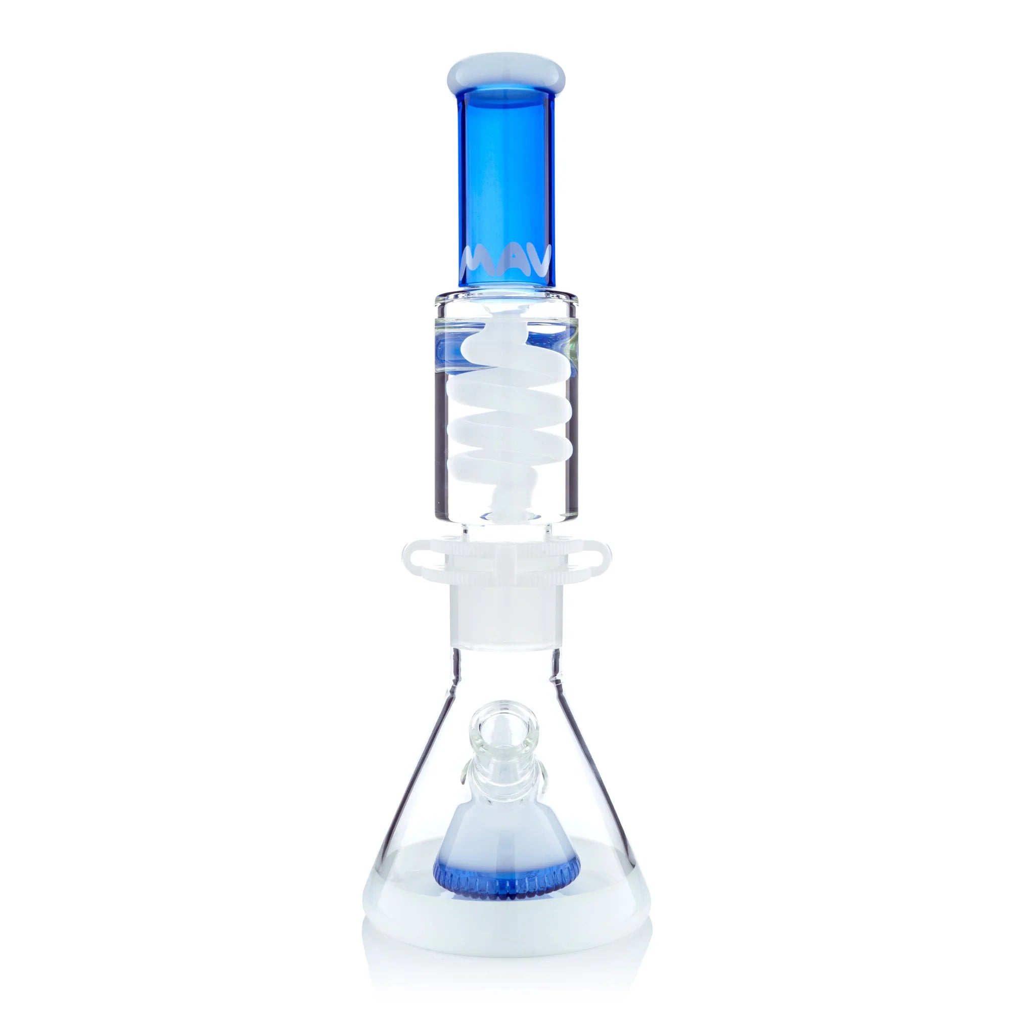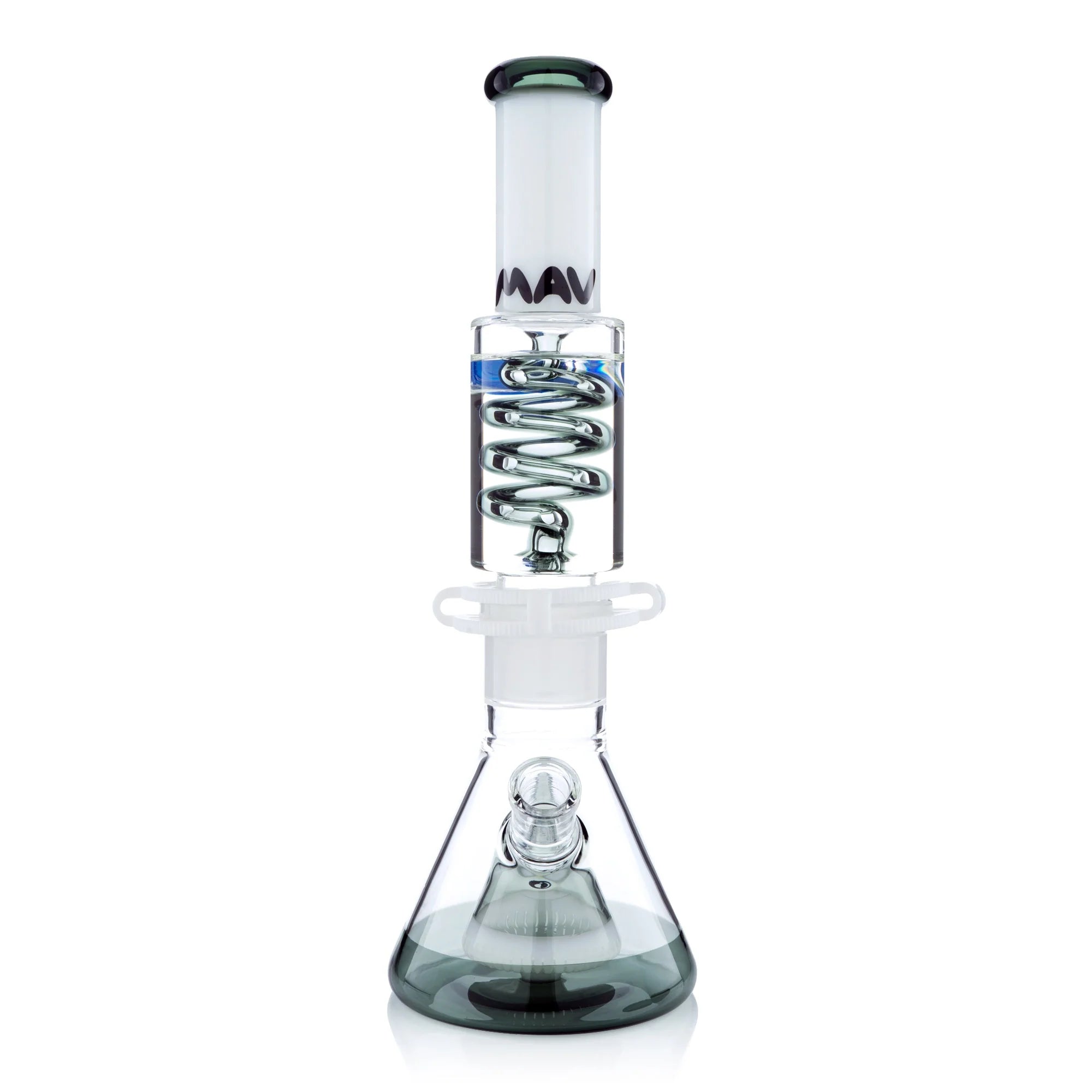 The Mav Glass Slitted Pyramid Beaker Freezable Coil System features a removable glycerin coil chamber that chills vapor through sub-zero temperature retention without freezing solid, paired with a slitted pyramid percolator at the base for additional diffusion. This 14" tall beaker includes a 19mm female joint with holding clip, matching 19mm accessory, and uniquely designed cap, requiring careful handling with base support due to its two-piece construction.