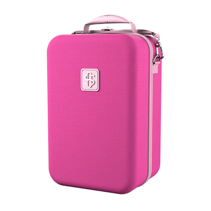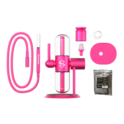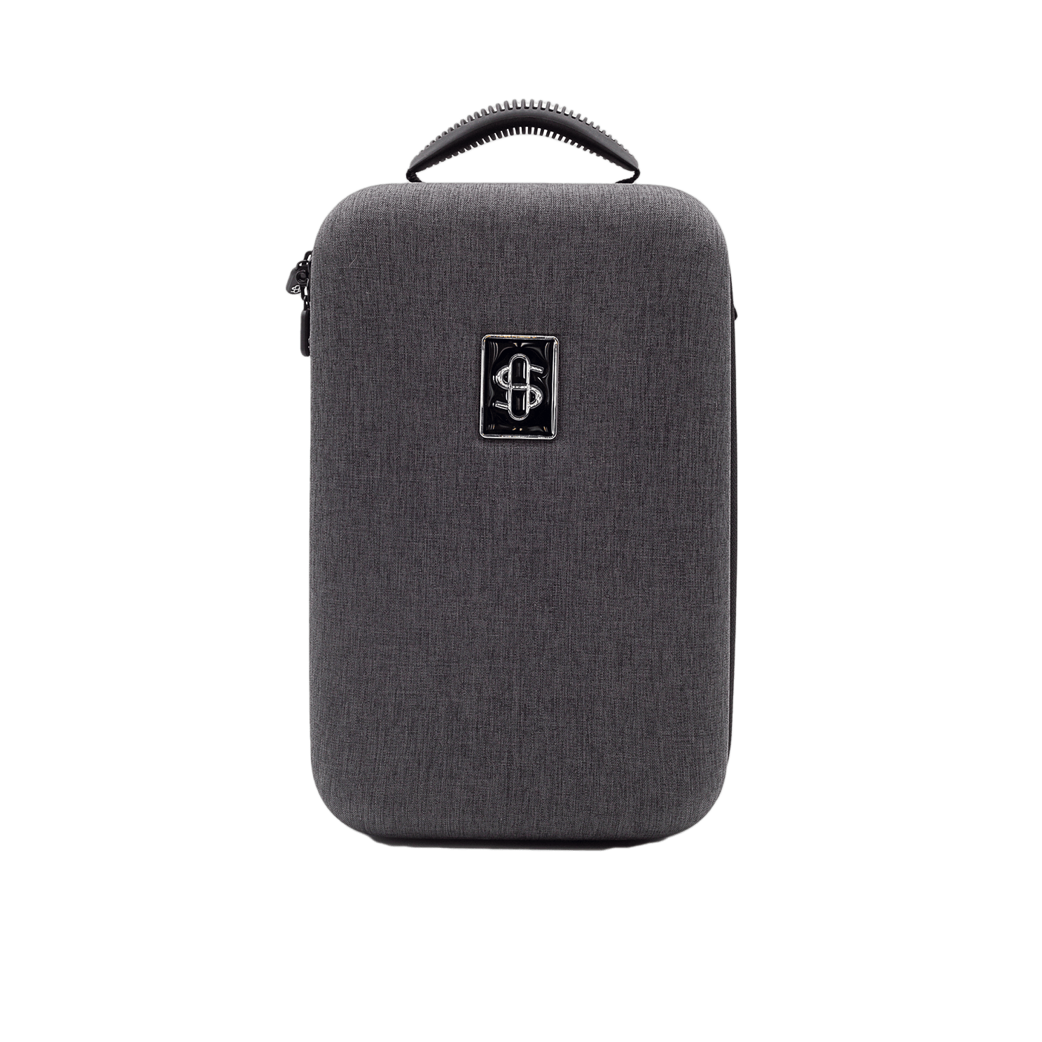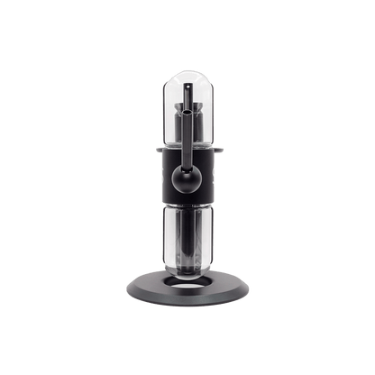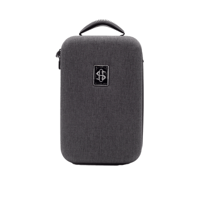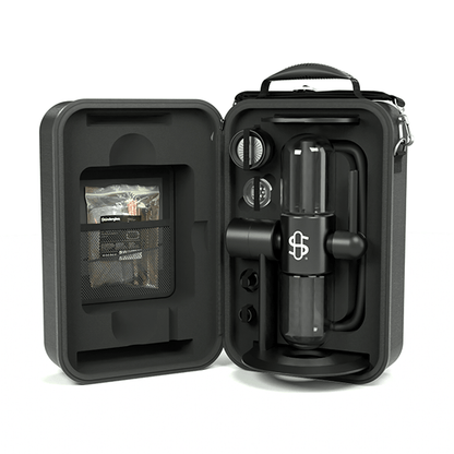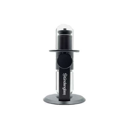 The Stündenglass Kompact Gravity Infuser features the patented 360° rotating gravity system in a portable design standing just under 12" tall with borosilicate glass globes holding 2 cups of water and aircraft-grade anodized aluminum construction. This complete system includes an aluminum chamber kit, glass liner, 3-foot silicone hose, 45° adjustable mouthpiece with 14mm male joint compatibility, and a custom-fit travel case with metal inlayed logo plate, carrying handle, shoulder strap, and interior accessory pocket. The Kompact arrives fully assembled and generates kinetic motion through cascading water displacement and gravity-driven airflow technology.