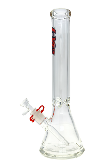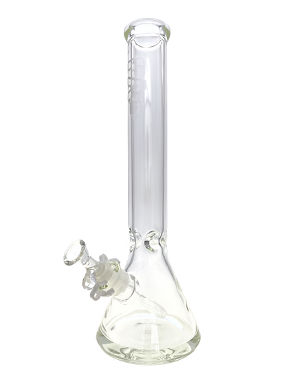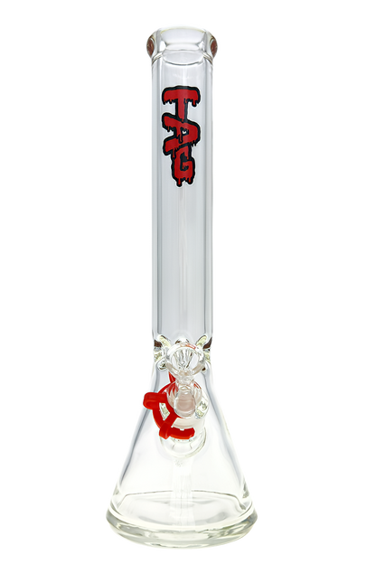 The TAG Large Beaker stands 16" tall with extra-thick 50x7mm borosilicate glass construction featuring a reinforced beaker base and chamfered edge design. This water pipe includes an 18mm to 14mm removable Super Slit Downstem (4"), pinched screen slide, Keck clip, integrated ice pinches, and a thick rounded mouthpiece for comfortable sessions.