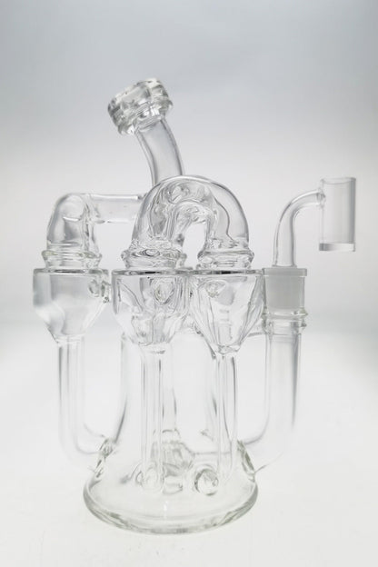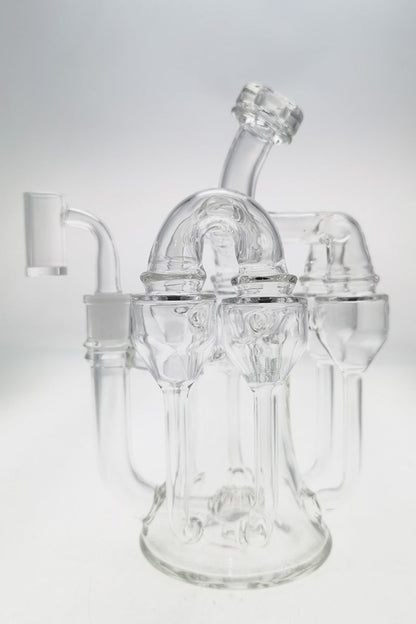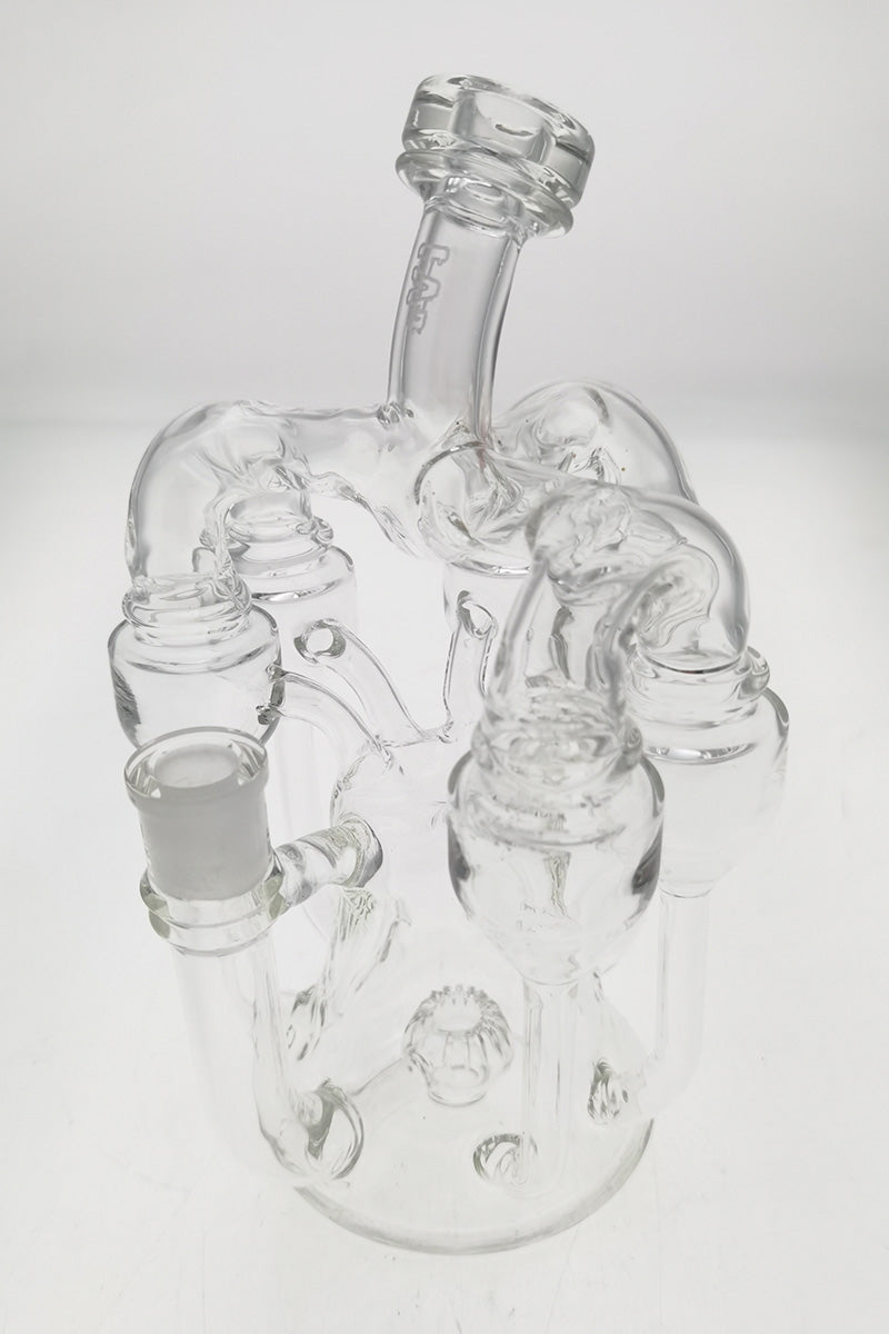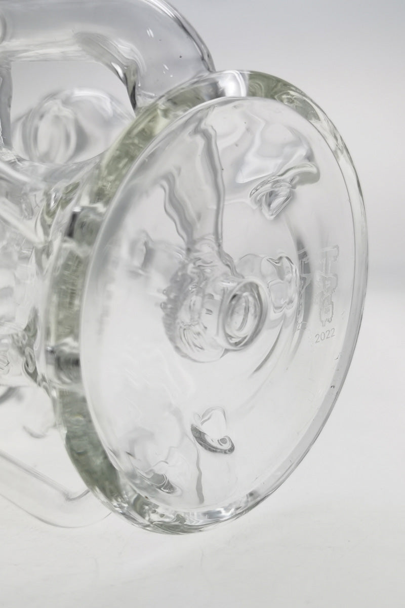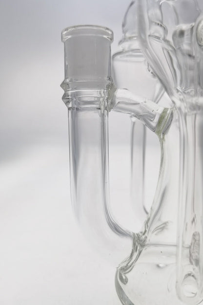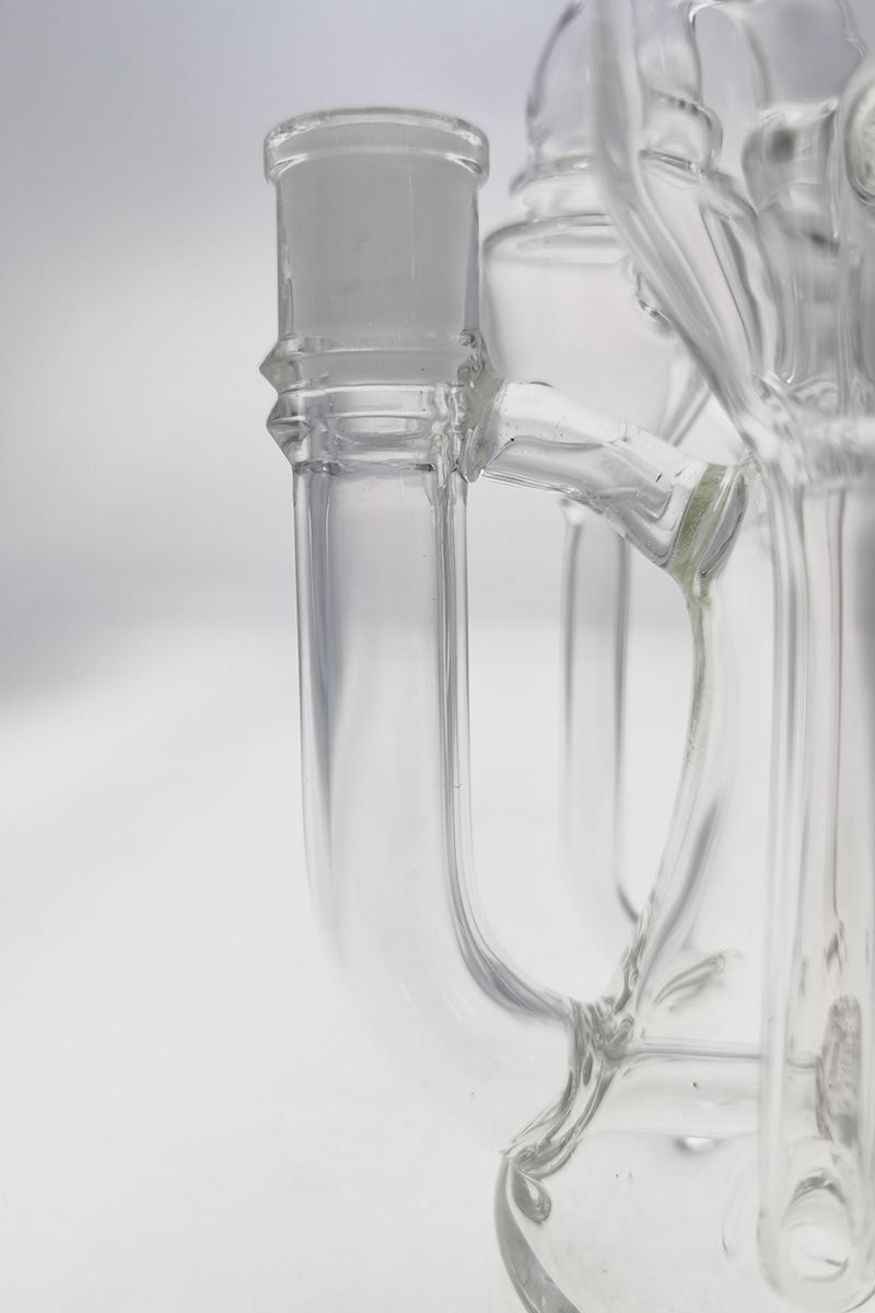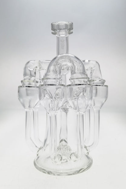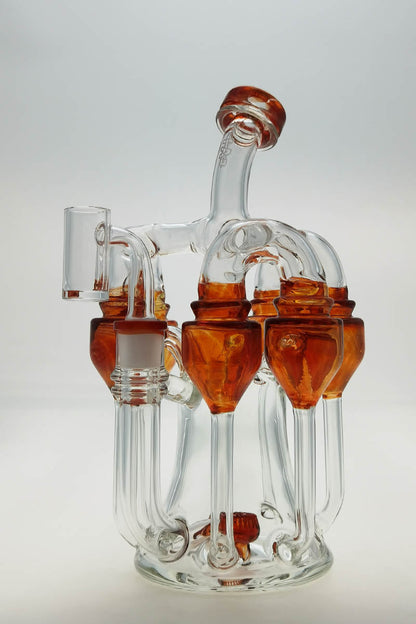 The TAG Inline Sextuple Recycler features six individual recycler uptakes working in synchronized motion through 8" of thick borosilicate glass construction, with a showerhead percolator at the base splitting vapor into micro-bubbles for maximum cooling and diffusion. This compact concentrate rig includes a 14mm female joint with banger, and the multi-arm recycling system extends vapor contact time while preventing splashback, delivering smooth filtration without added drag.