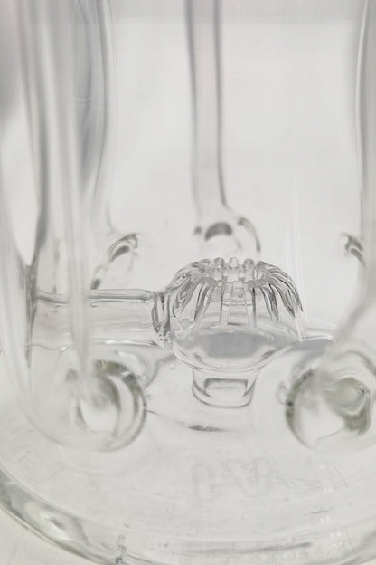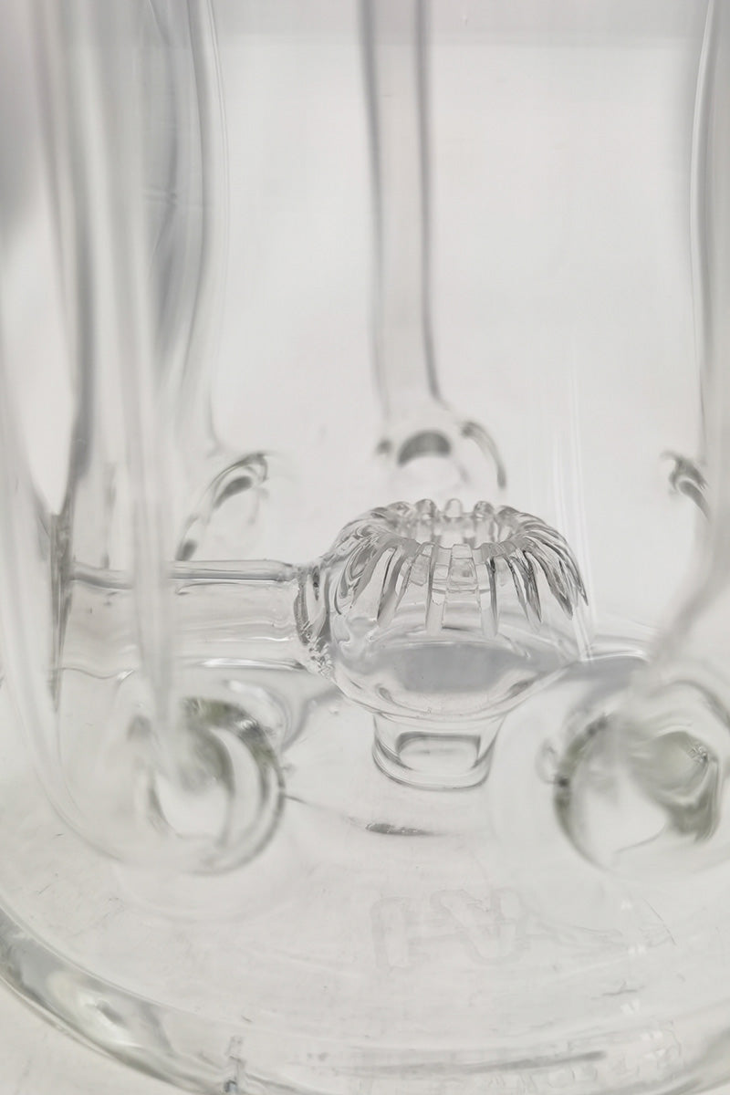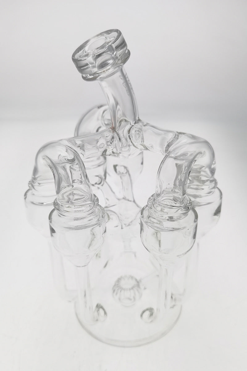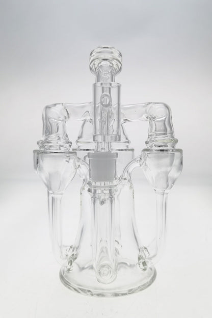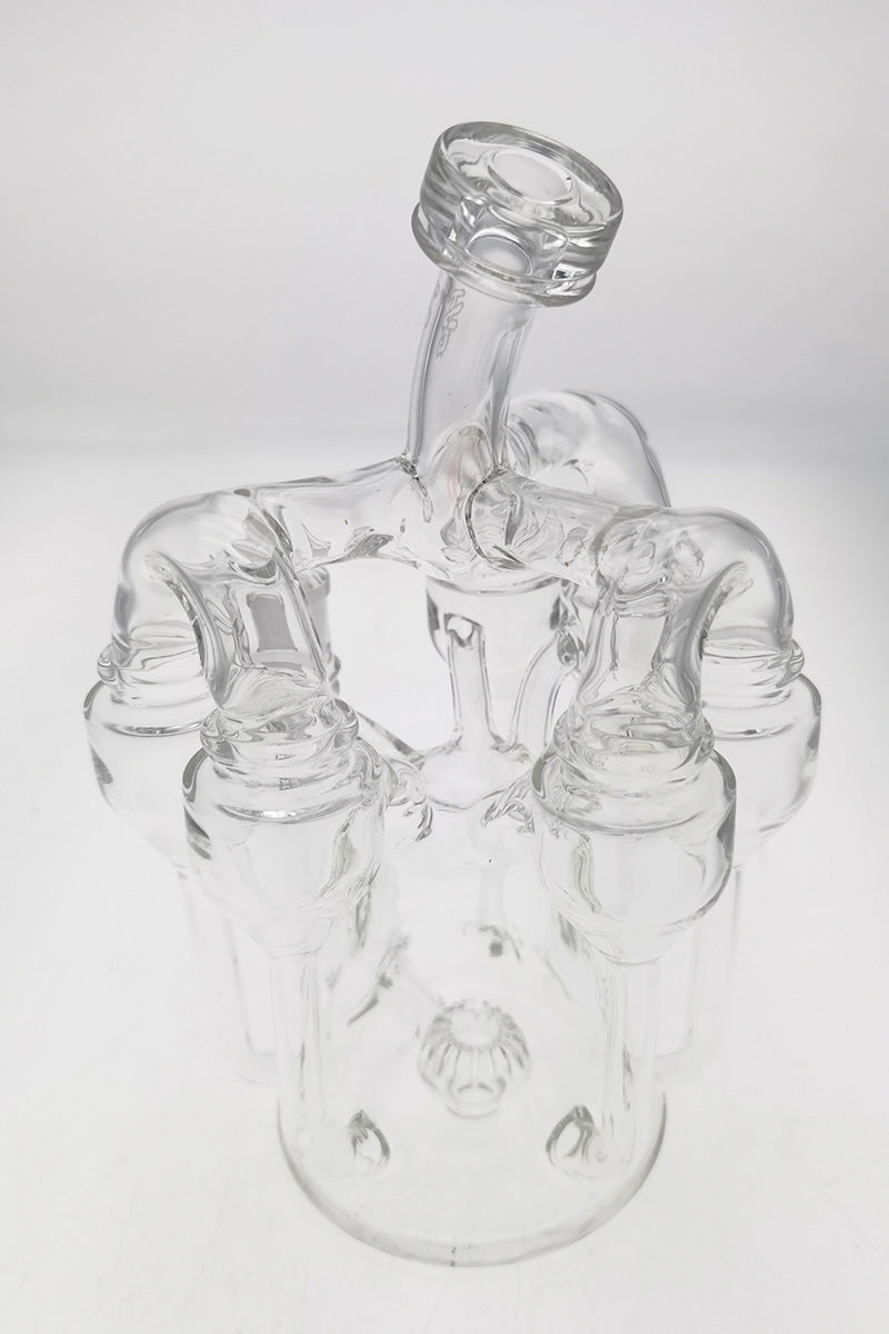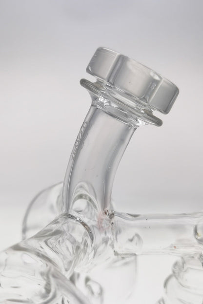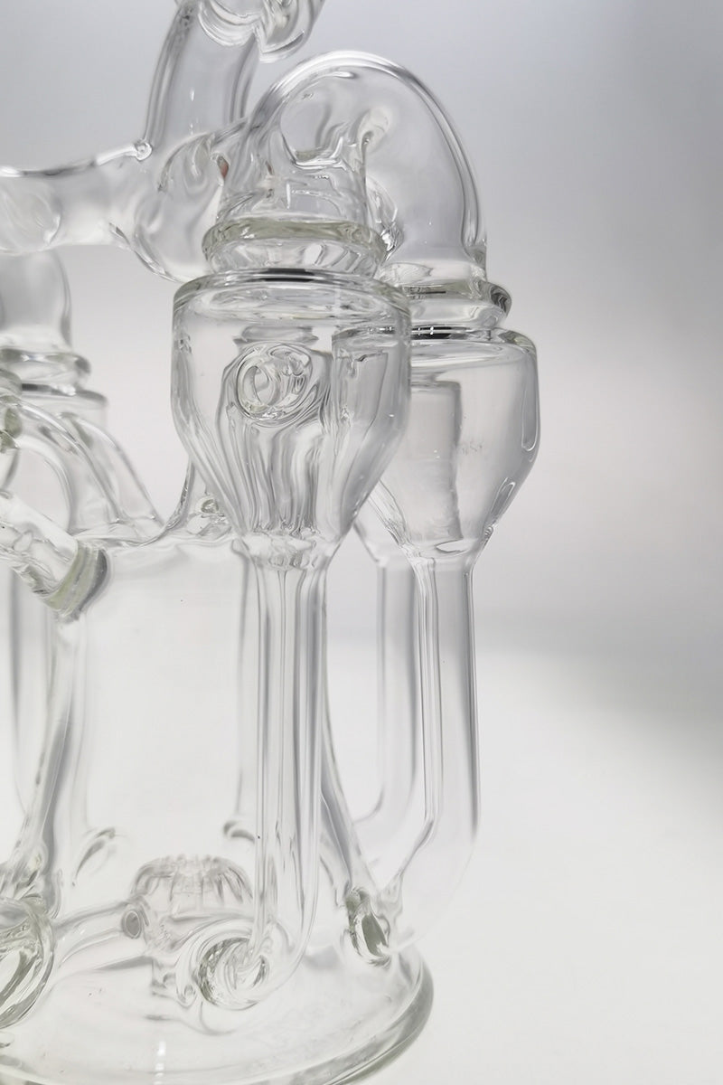 The TAG Inline Sextuple Recycler features six individual recycler uptakes working in synchronized motion through 8" of thick borosilicate glass construction, with a showerhead percolator at the base splitting vapor into micro-bubbles for maximum cooling and diffusion. This compact concentrate rig includes a 14mm female joint with banger, and the multi-arm recycling system extends vapor contact time while preventing splashback, delivering smooth filtration without added drag.