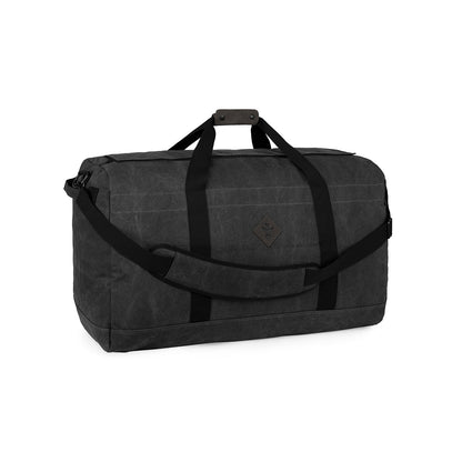The Revelry Supply Continental provides 134 liters of smell-proof storage at 30" x 17" x 16" through an integrated carbon filtration system and waterproof zipper with hook-and-loop covering. This large duffle features rubber-backed exterior construction, custom protective lining, lockable hardware, inner stash pocket, dual end handles, removable shoulder strap, and genuine leather accents for high-volume transport.