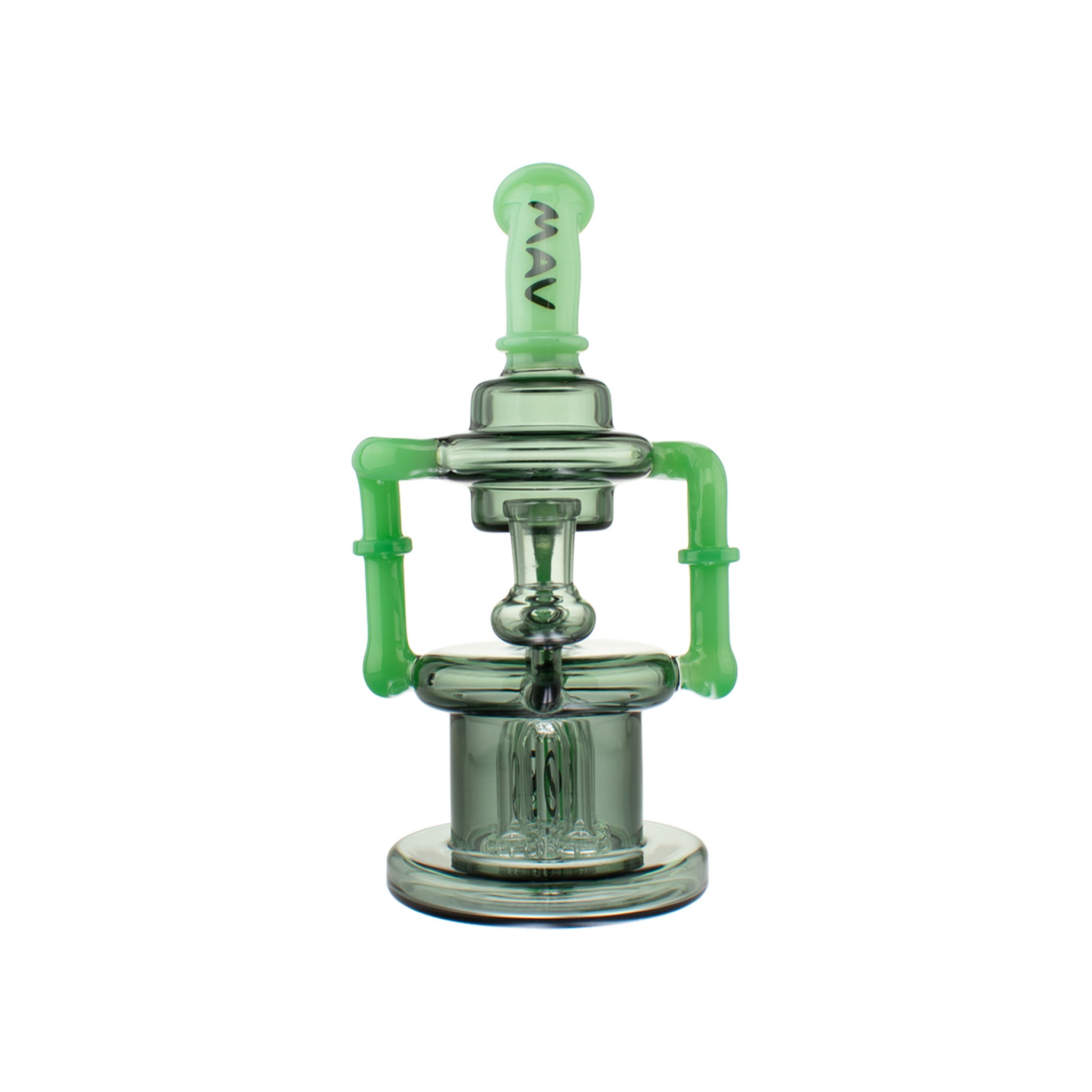 The MAV Glass Pasadena Microscopic Quad Shower Bent Neck Recycler incorporates a distinctive microscope-inspired design with dual uptake tubes that create continuous water circulation throughout the chamber. The piece features a quad-turbo shower percolator system that filters through multiple diffusion points, while the bent neck configuration provides ergonomic handling. This recycler design maintains water movement between chambers to enhance filtration and preserve flavor during sessions.