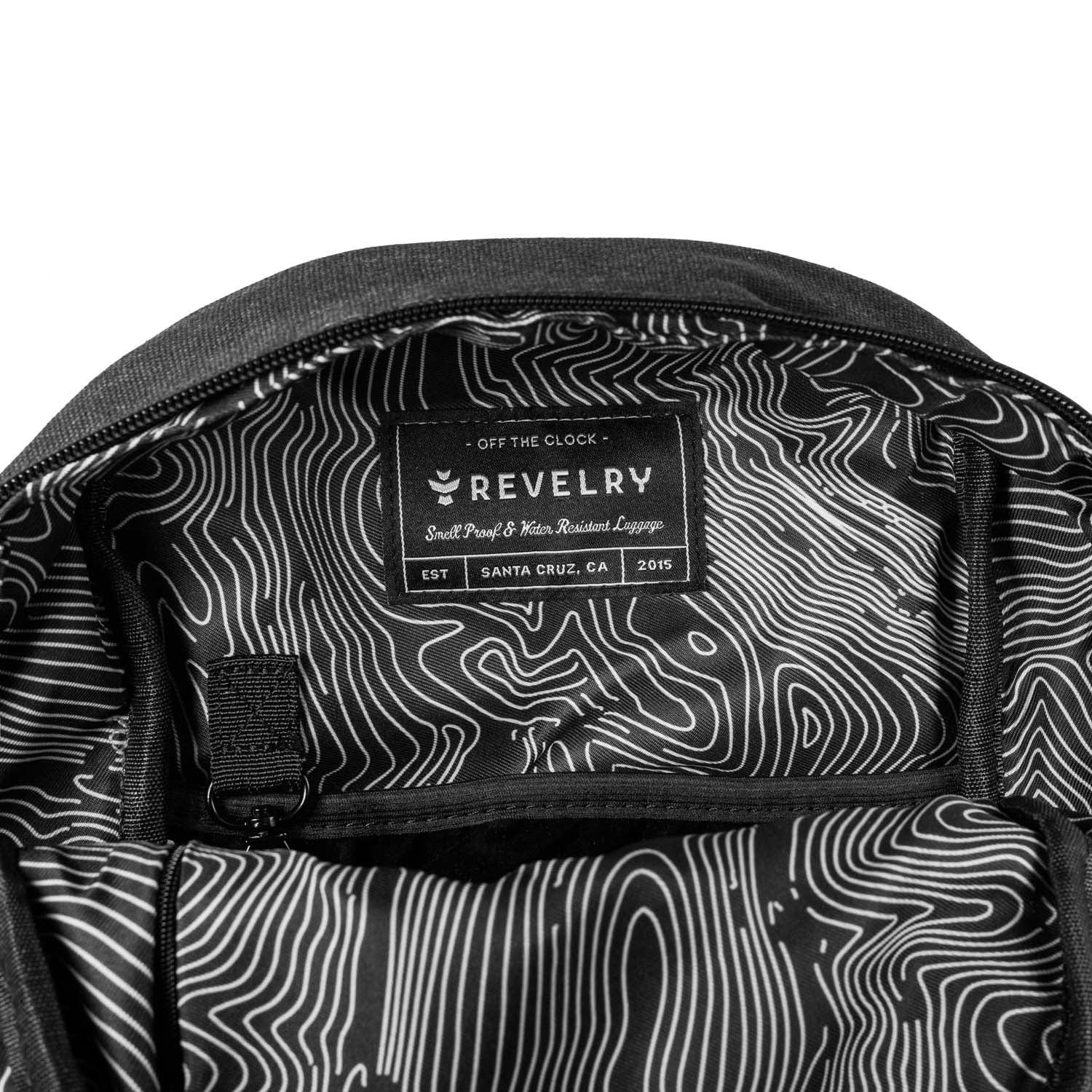 The Revelry Supply Shorty offers compact backpack storage with smell-proof construction, water-resistant exterior fabric, and integrated carbon filter technology for odor containment. This scaled-down version maintains the full-featured design of Revelry's original backpack in a travel-friendly profile.