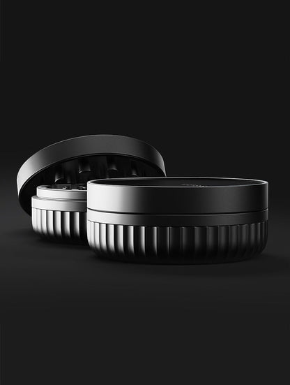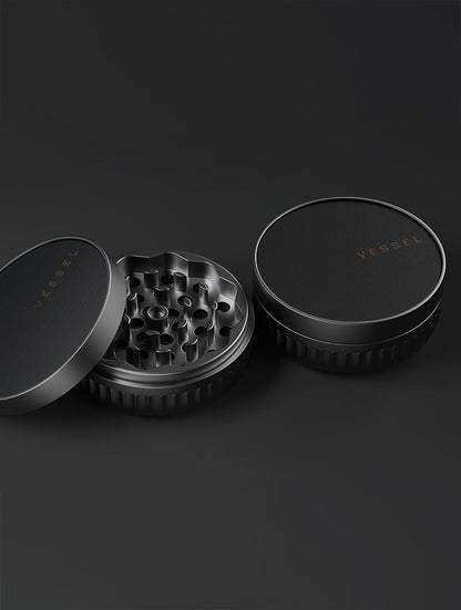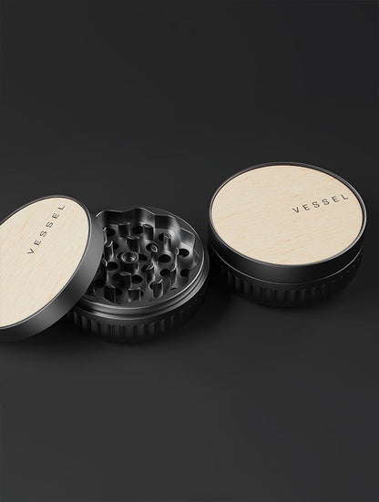 The Vessel Mill features a 3-piece aluminum construction with genuine blackwood inlay and magnetic lid closure for secure portability. Its knurled grip design provides tactile control while the precision-cut teeth create a consistent fine grind for botanicals. The compact form factor makes it easy to clean and transport while maintaining the durability needed for regular use.