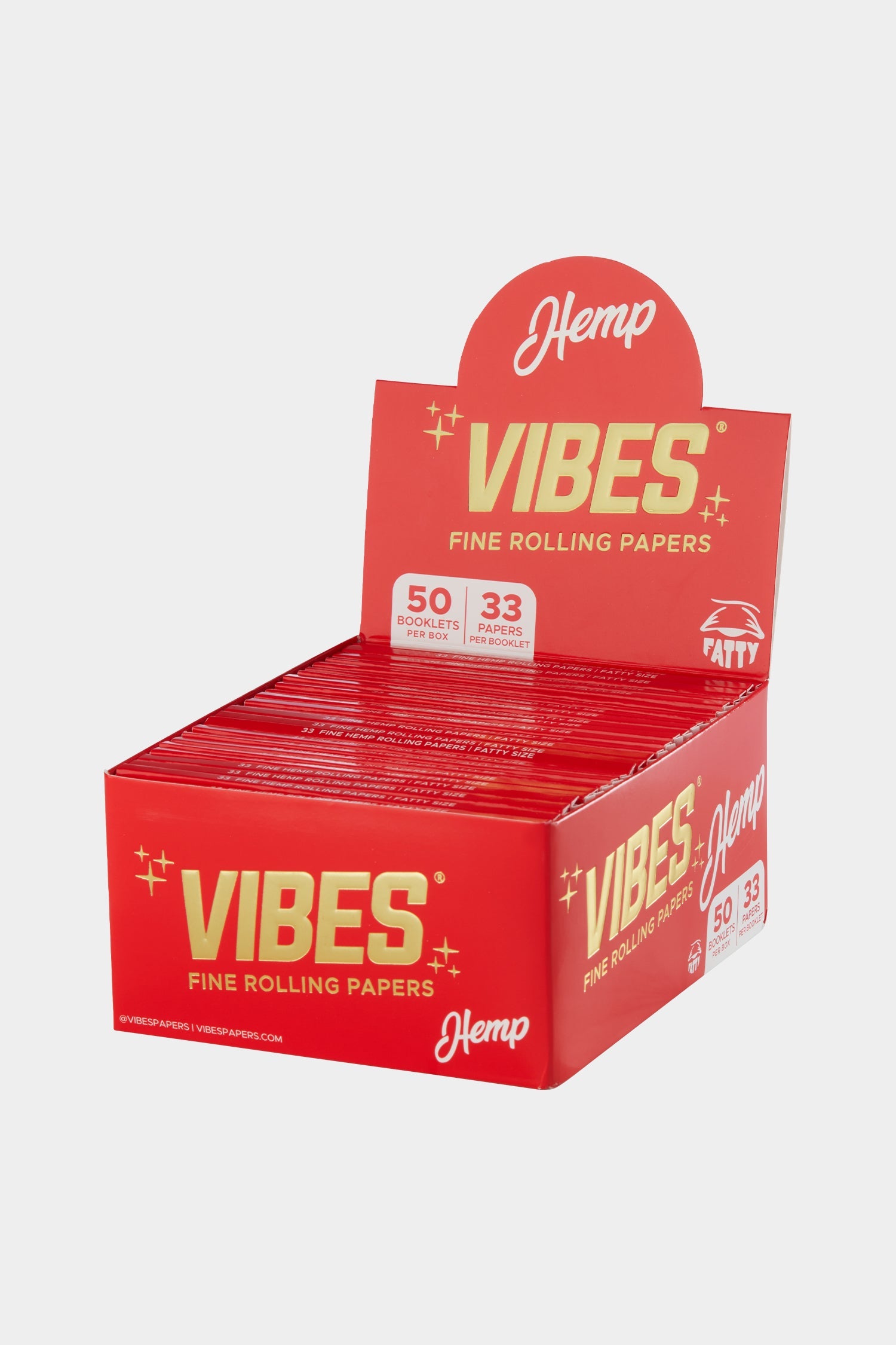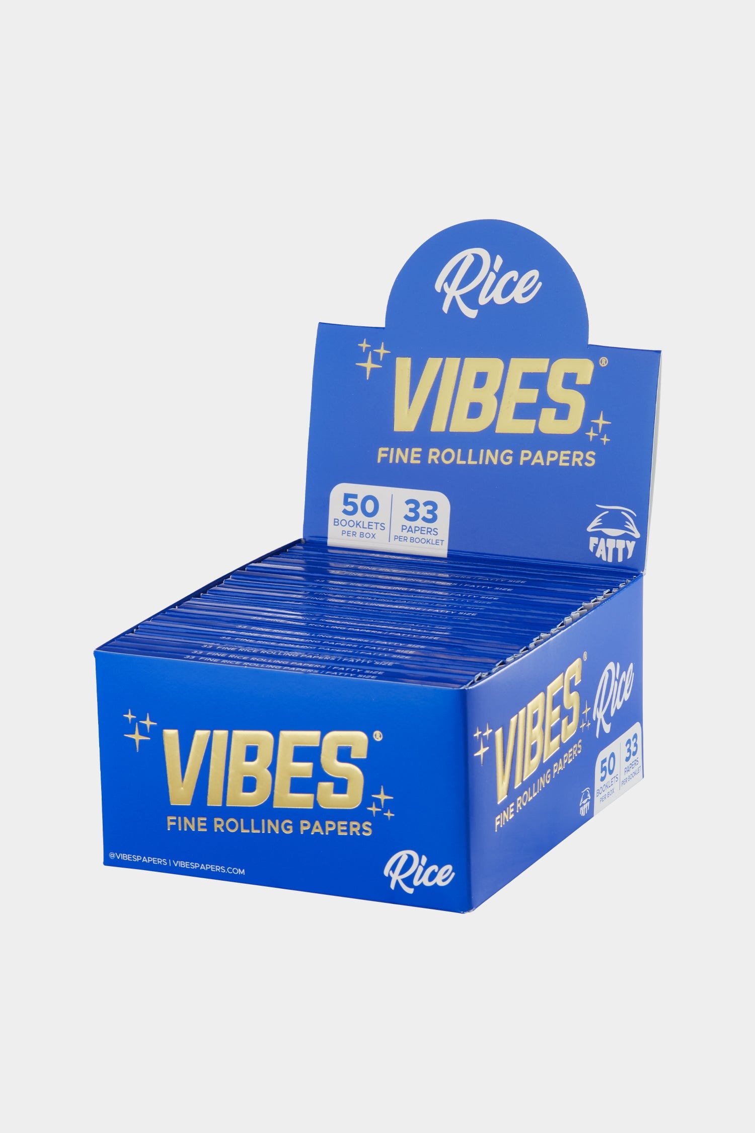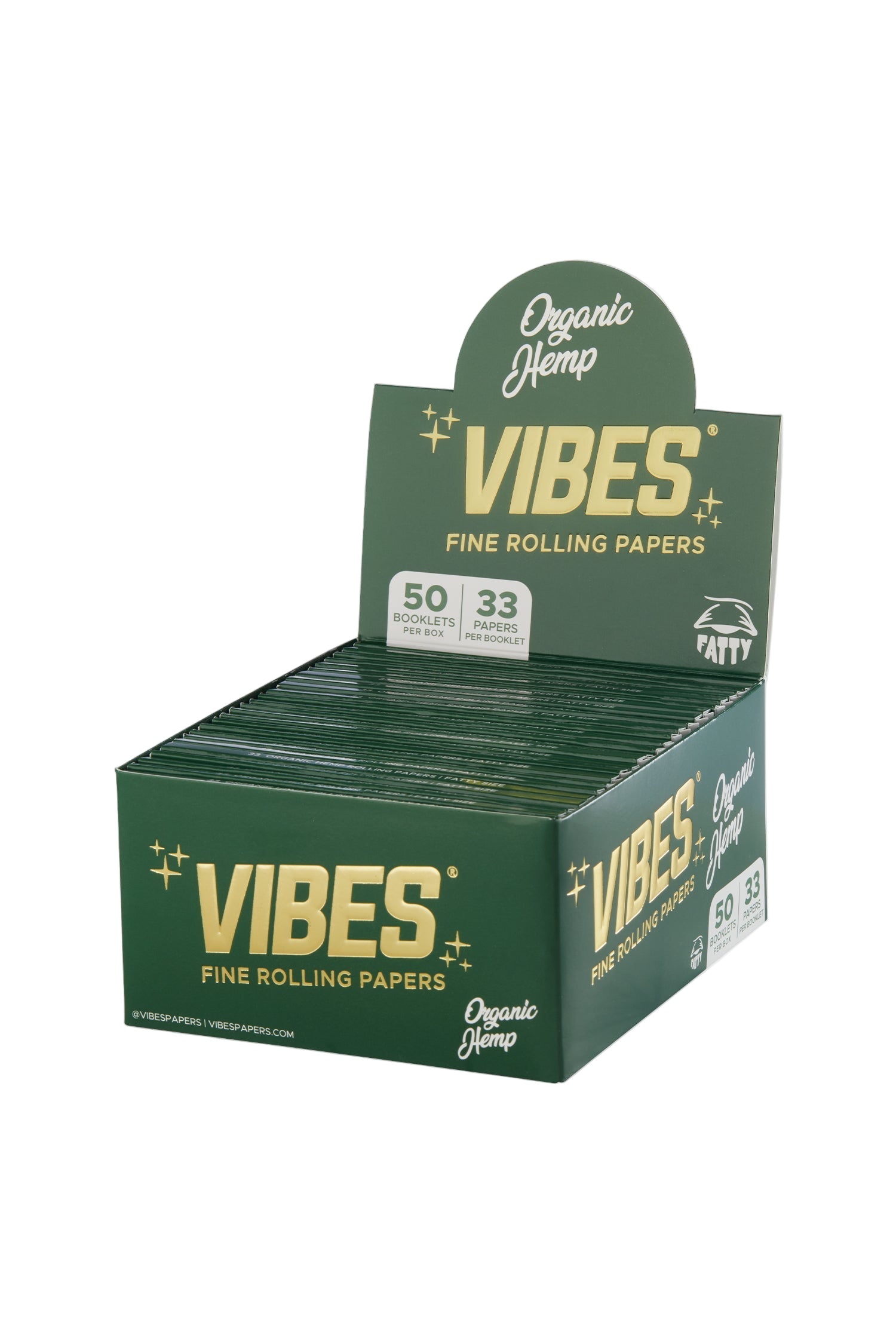 The VIBES Booklets Fatty 33 - 50 Display Box features 53mm double-wide premium rolling papers available in all VIBES paper blends including Blanco wood pulp, with natural arabic gum strip from Acacia. This display box contains 50 booklets of 33 papers each for high-volume rolling needs.