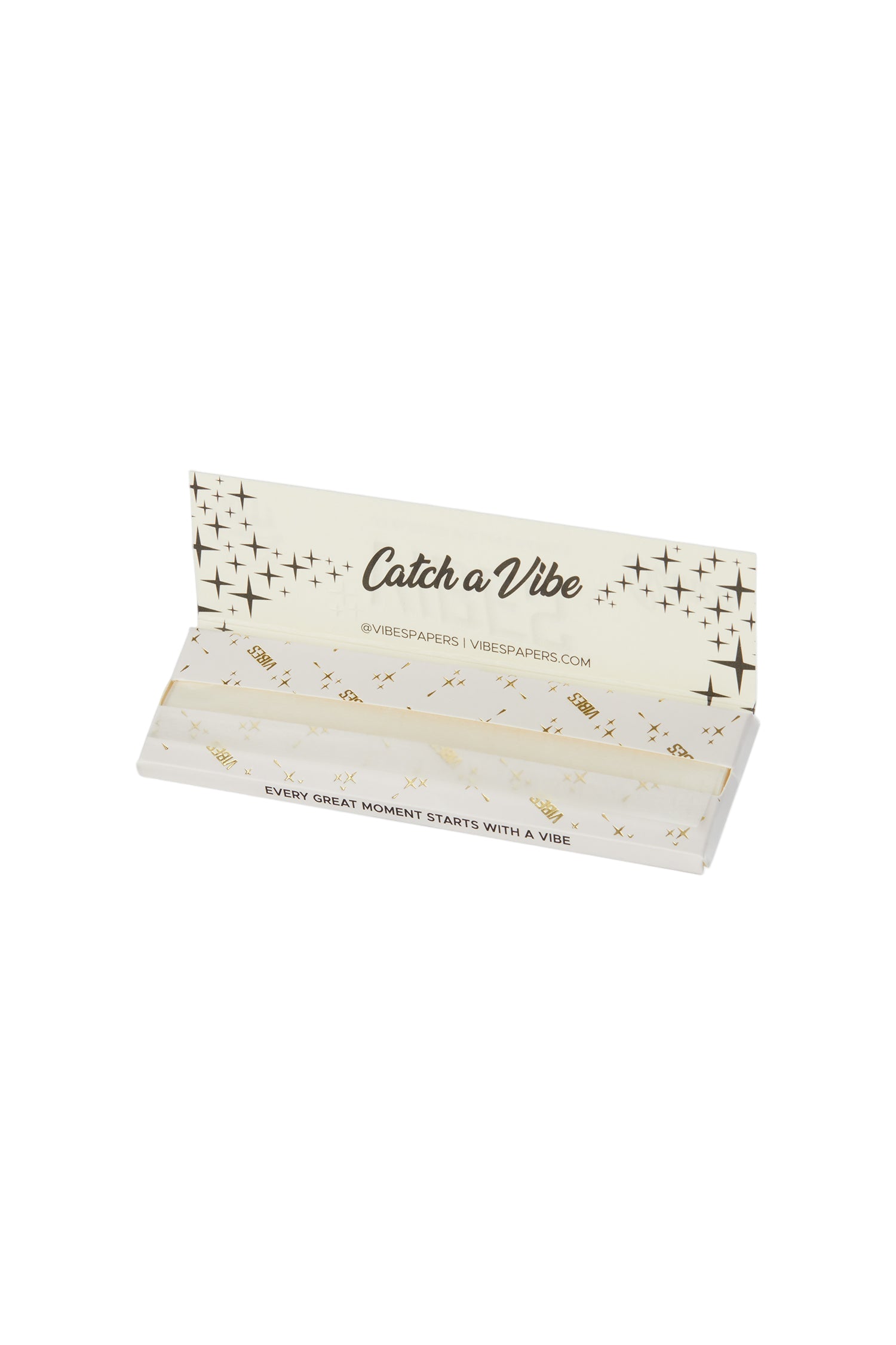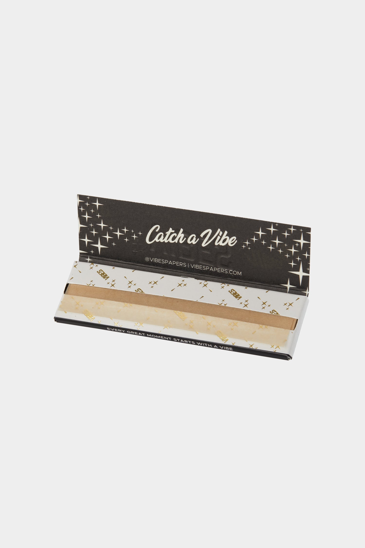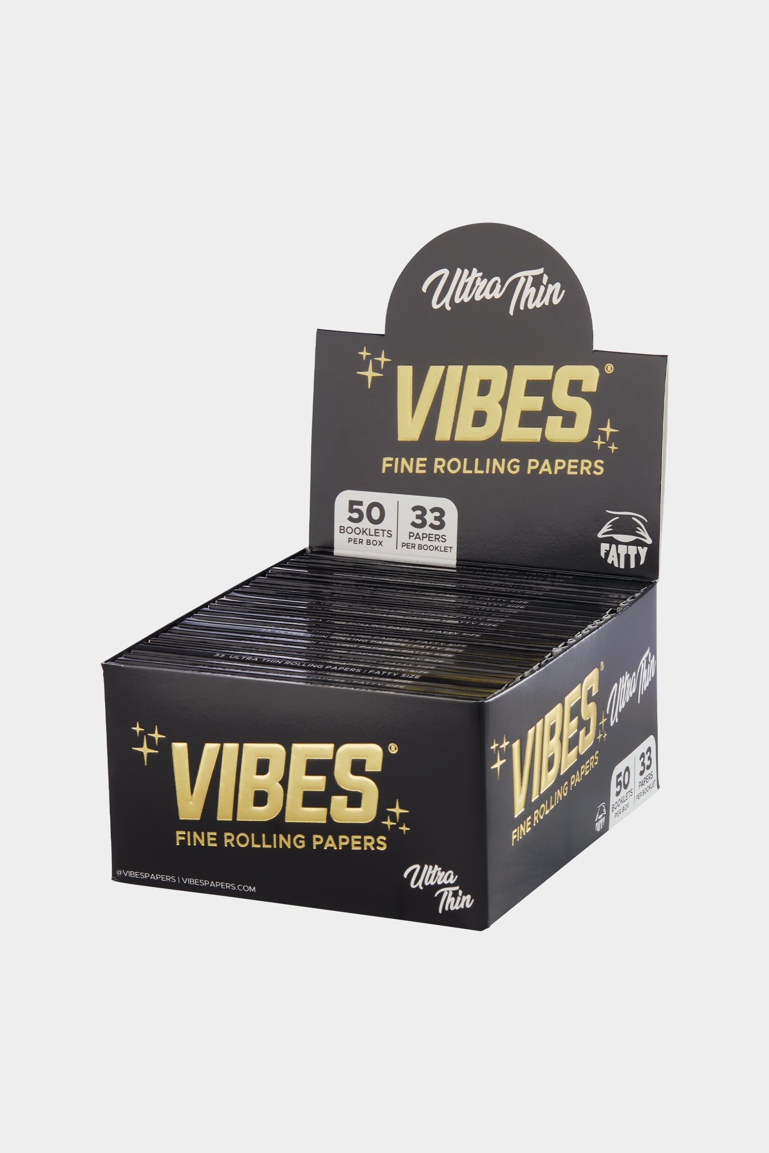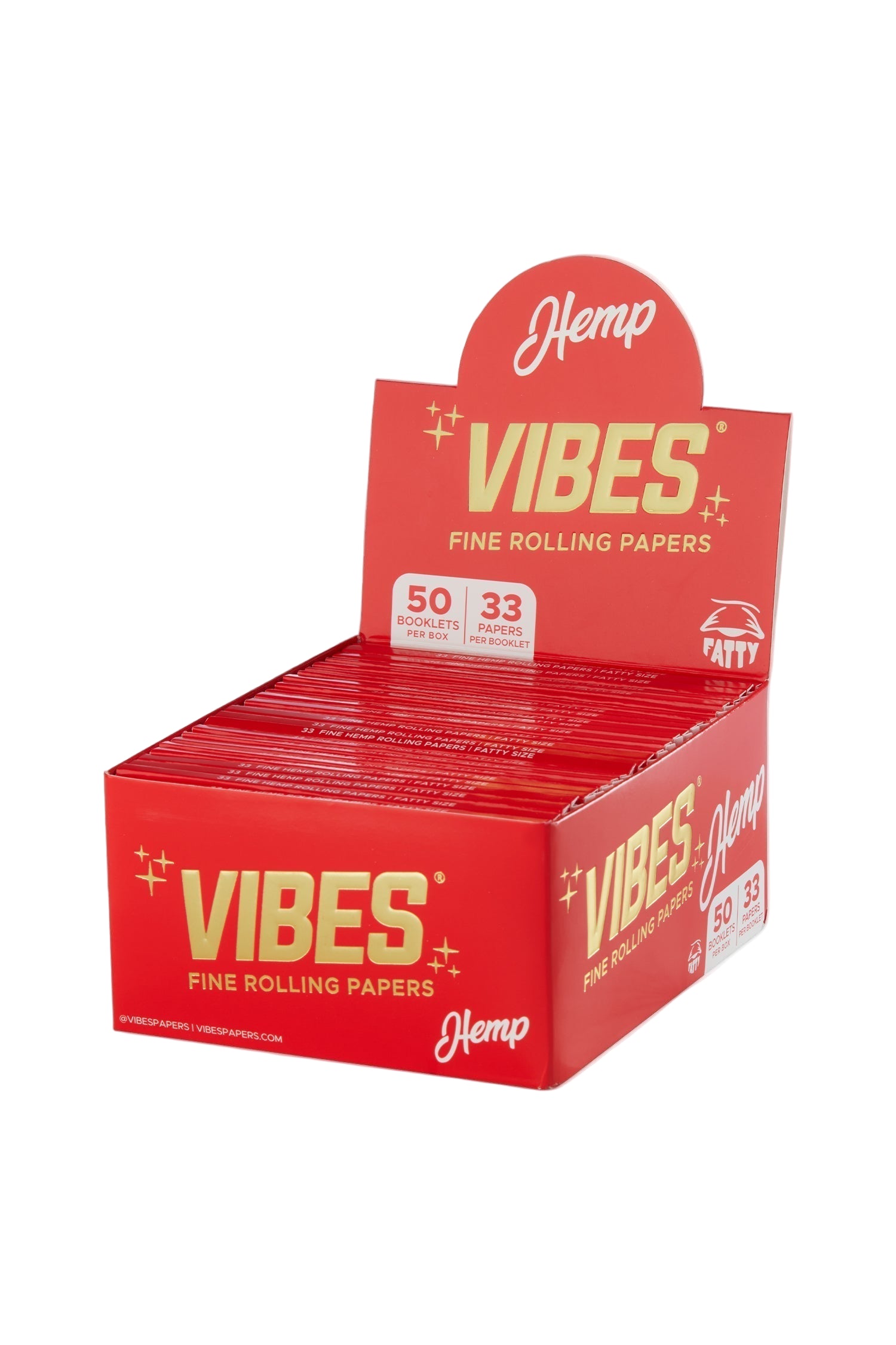 The VIBES Booklets Fatty 33 - 50 Display Box features 53mm double-wide premium rolling papers available in all VIBES paper blends including Blanco wood pulp, with natural arabic gum strip from Acacia. This display box contains 50 booklets of 33 papers each for high-volume rolling needs.