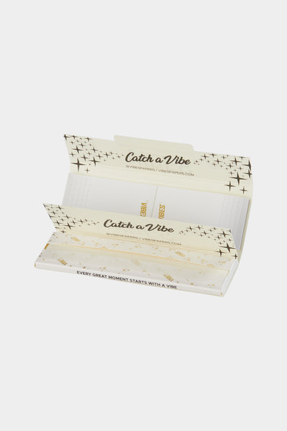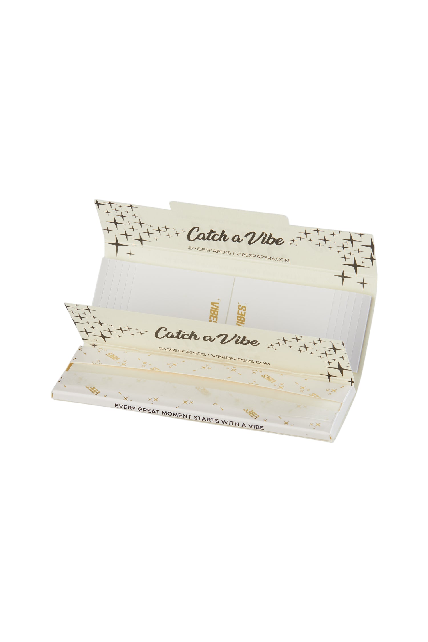 The VIBES Booklets with Tips Fatty 33 - 24 Display Box features 53mm double-wide premium rolling papers available in all VIBES paper blends, including Blanco wood pulp, with 33 fatty tips per booklet and natural arabic gum strip from Acacia. This display box contains 24 booklets designed for wider rolling applications.
