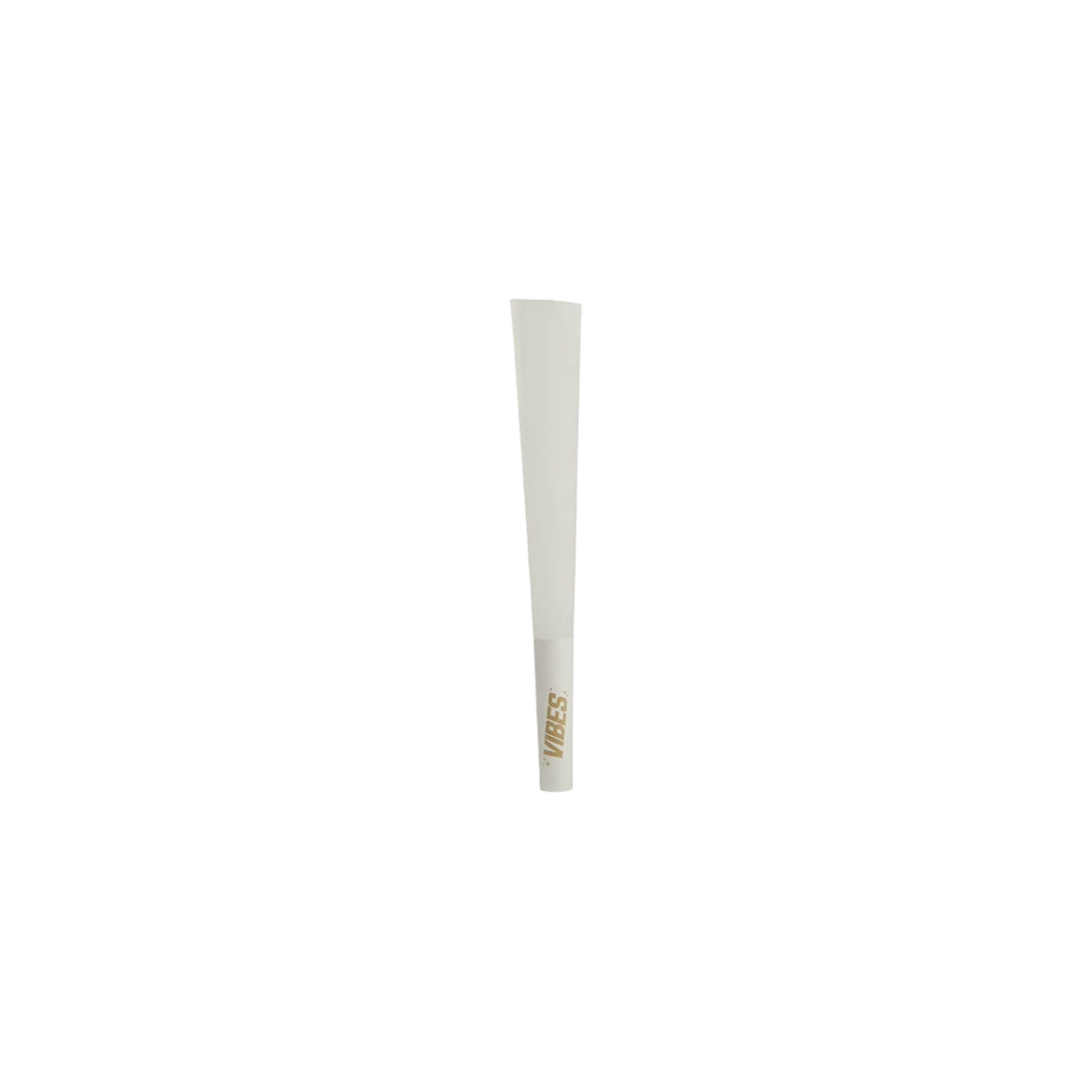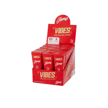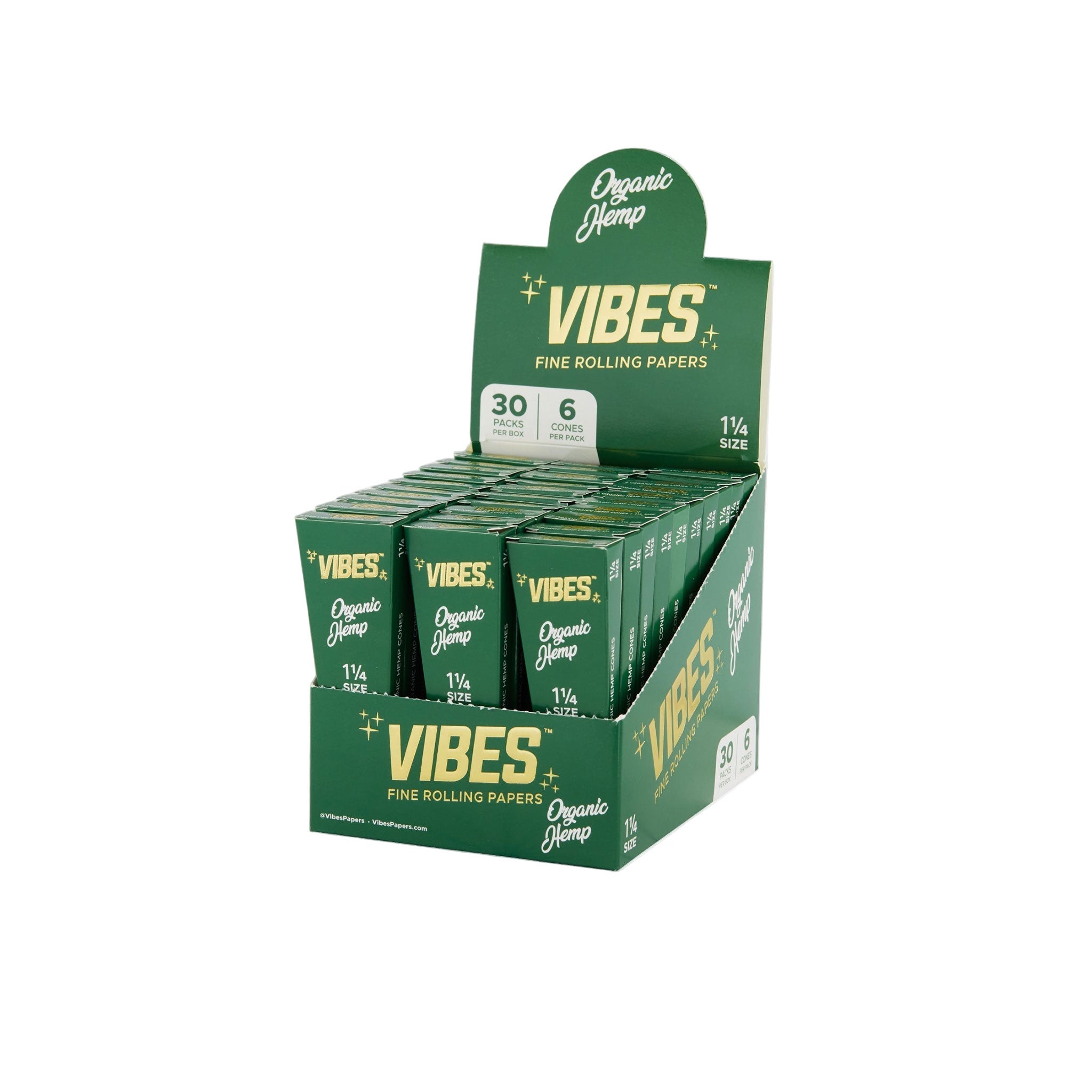The VIBES Cones Box 1.25" contains 30 coffins with 6 cones each, totaling 180 standard-length cones available in Ultra Thin, Rice, Organic Hemp, or Hemp varieties. These cones feature proprietary airflow design for consistent draws and slow, even burning.