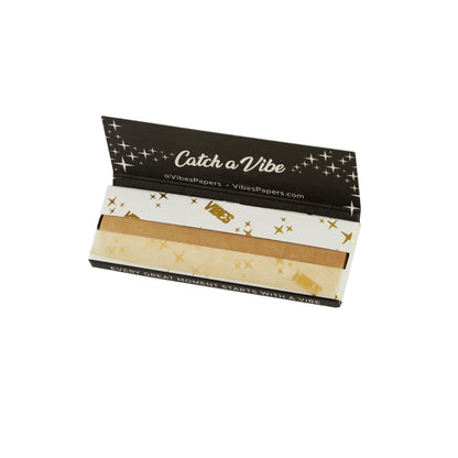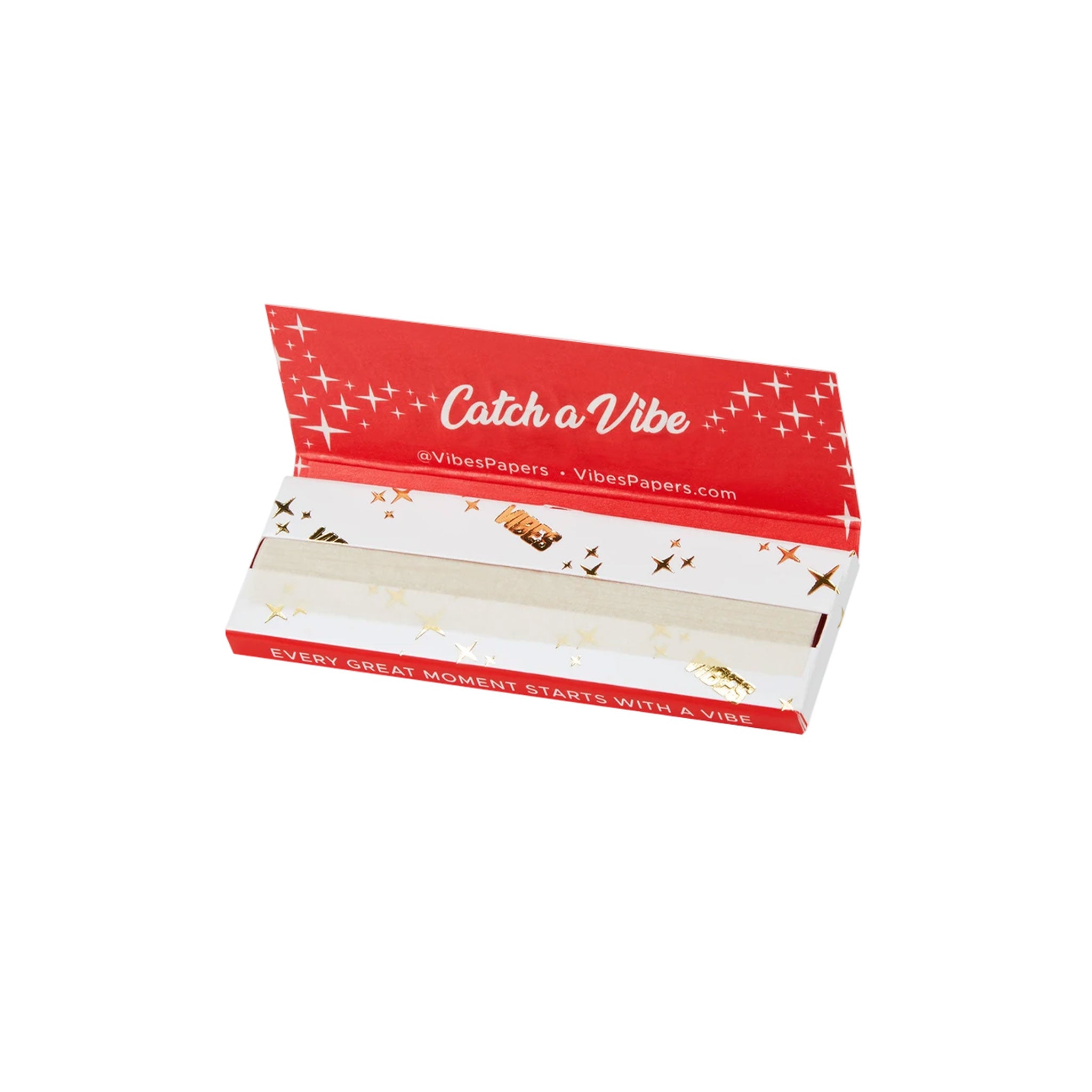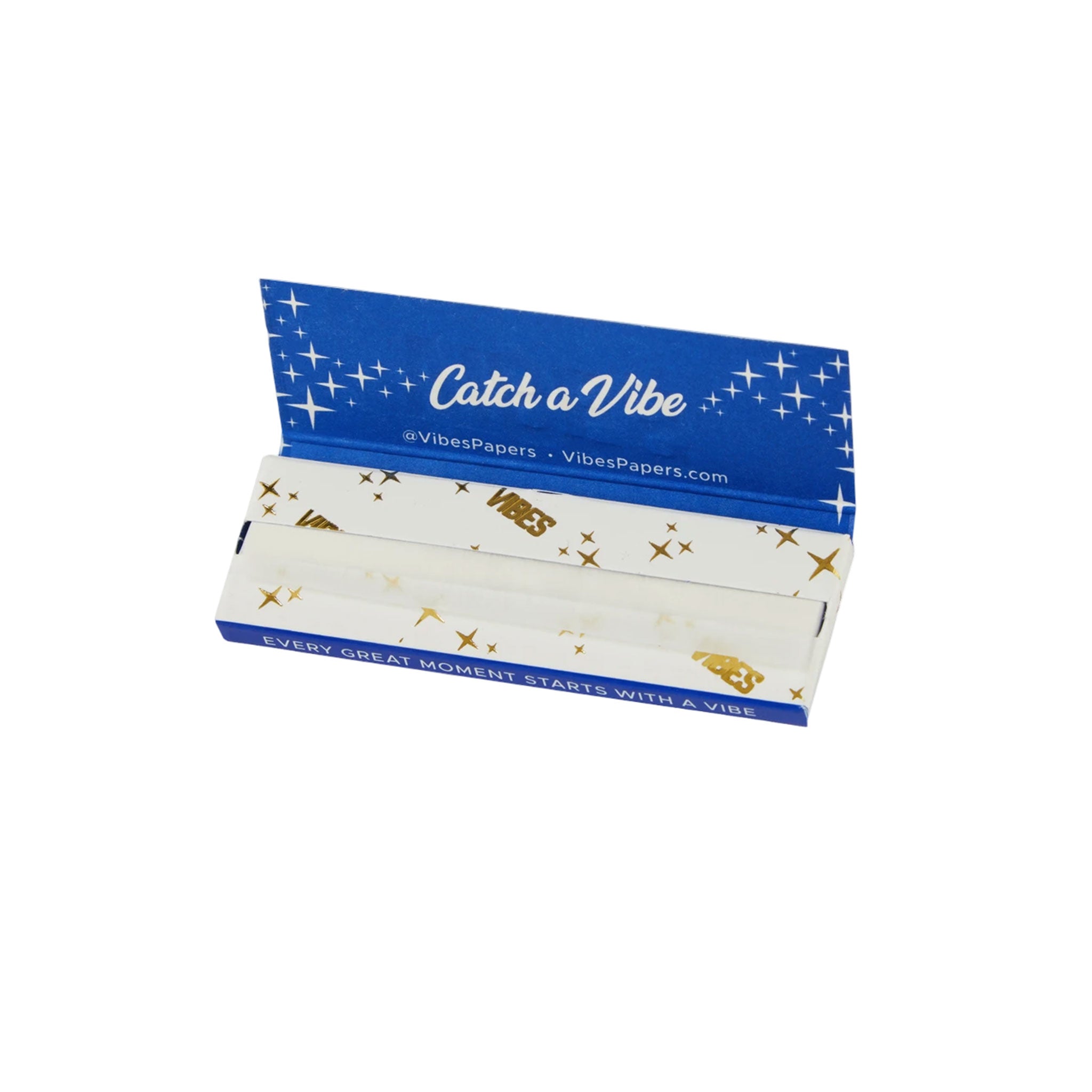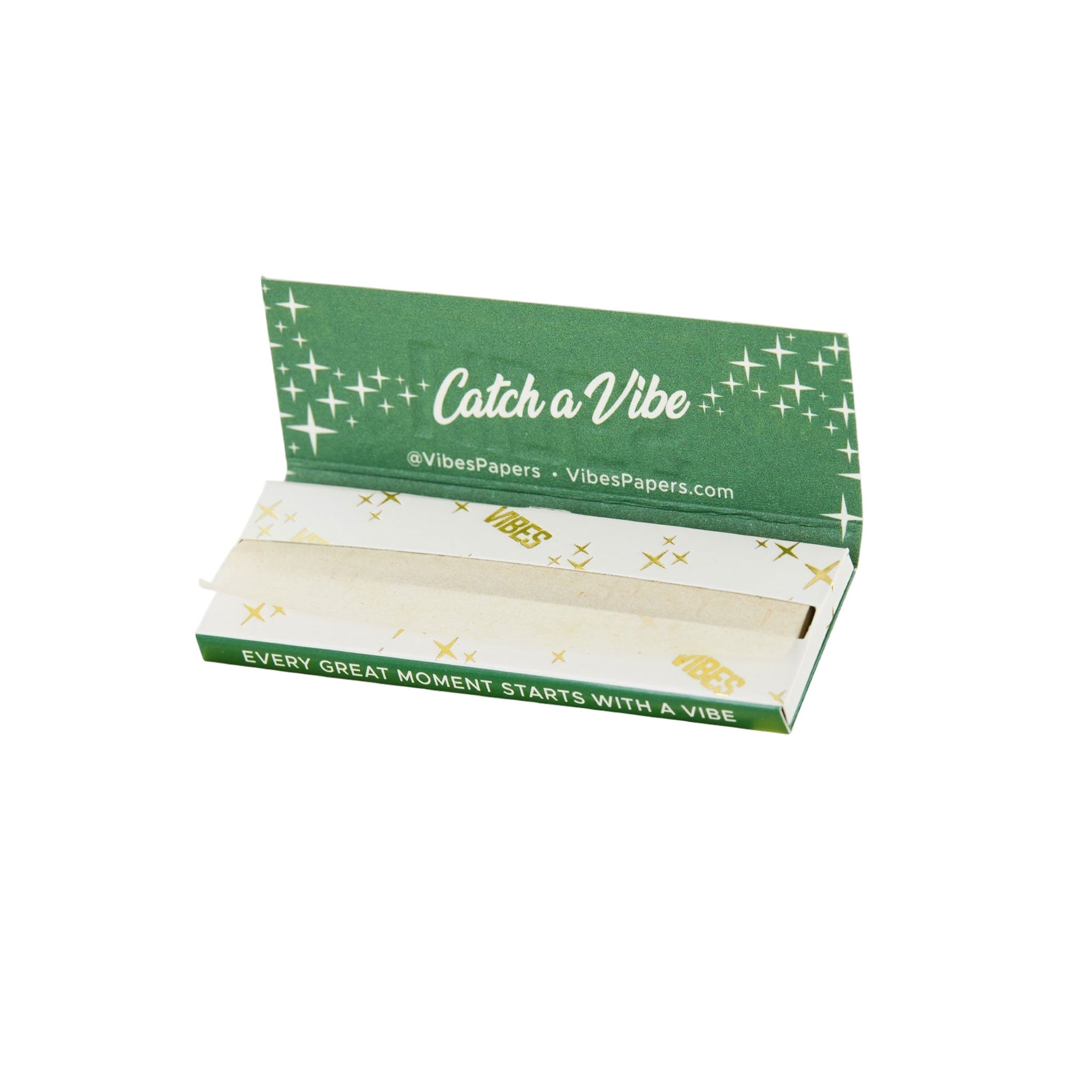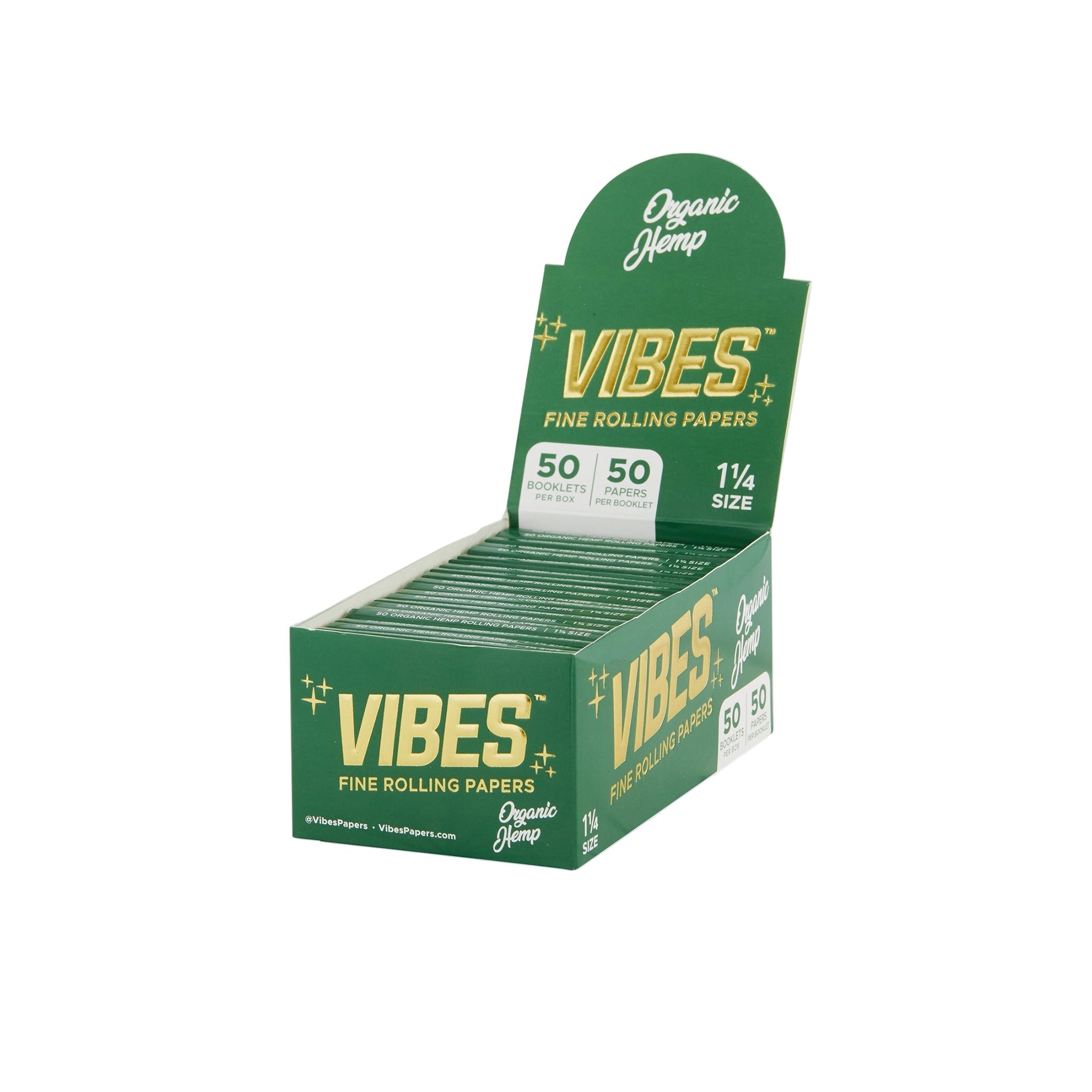 The VIBES Papers Box 1.25" contains 50 booklets with 50 papers each, totaling 2,500 rolling papers available in Hemp, Rice, Ultra Thin, or Organic Hemp varieties. These French-cultivated papers feature slow-burning characteristics with options for extended sessions or enhanced flavor profiles.